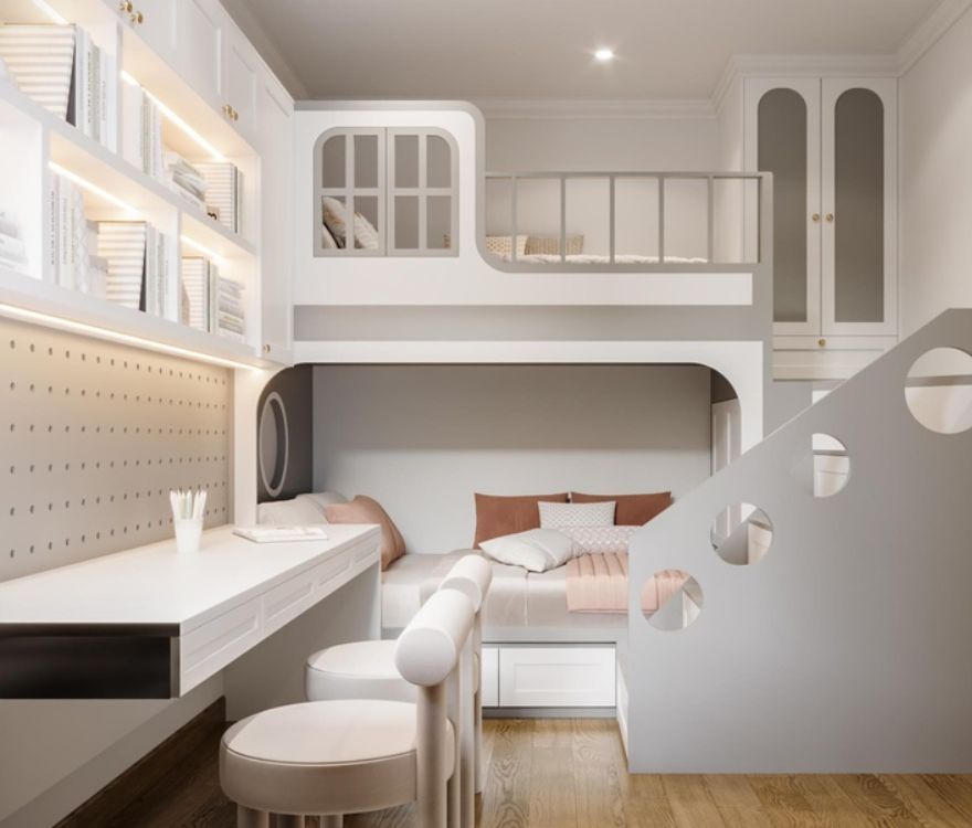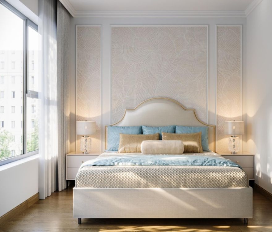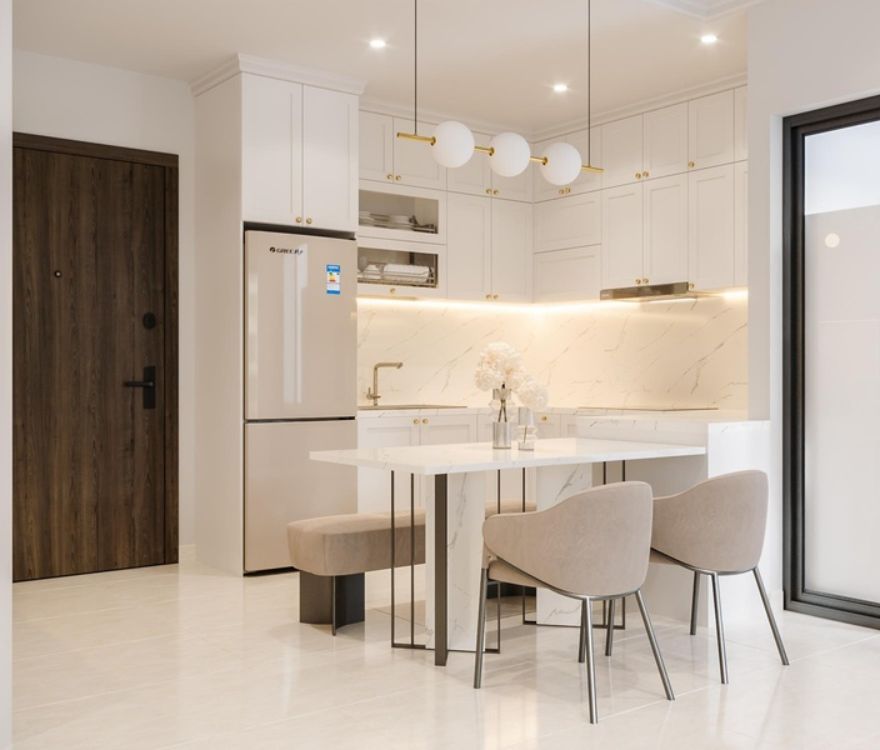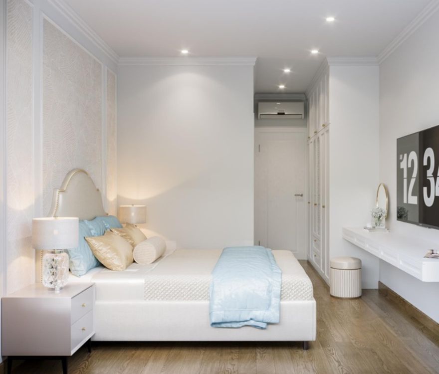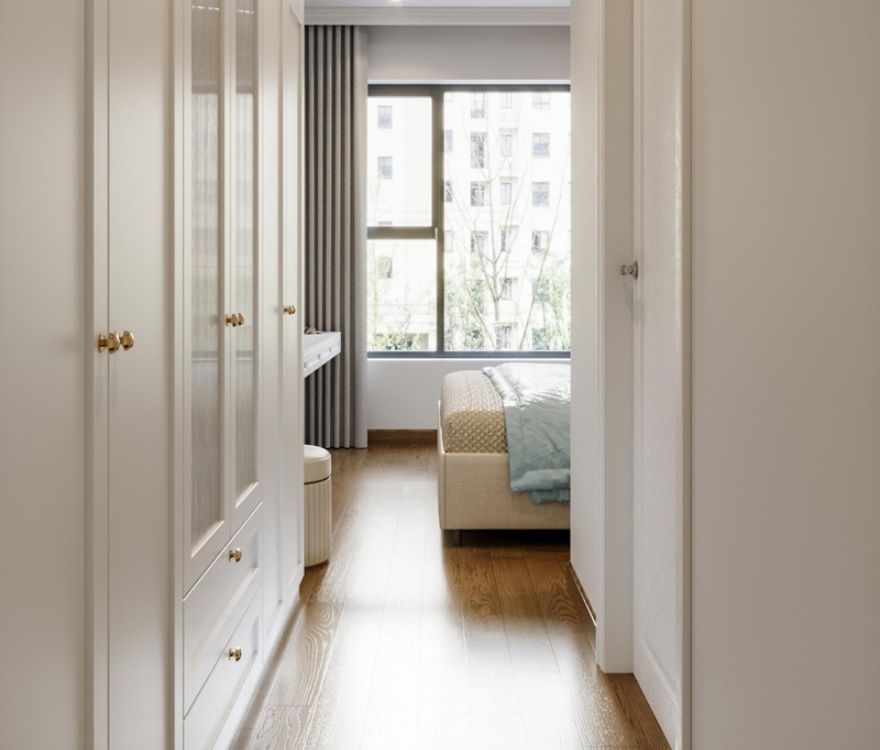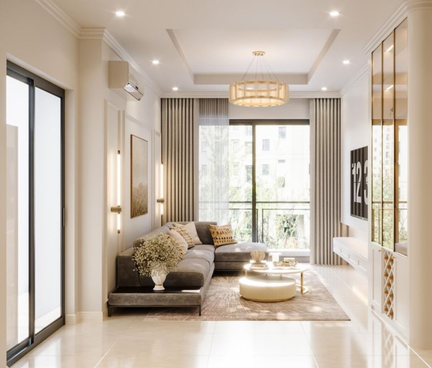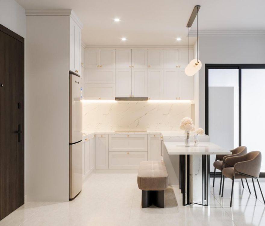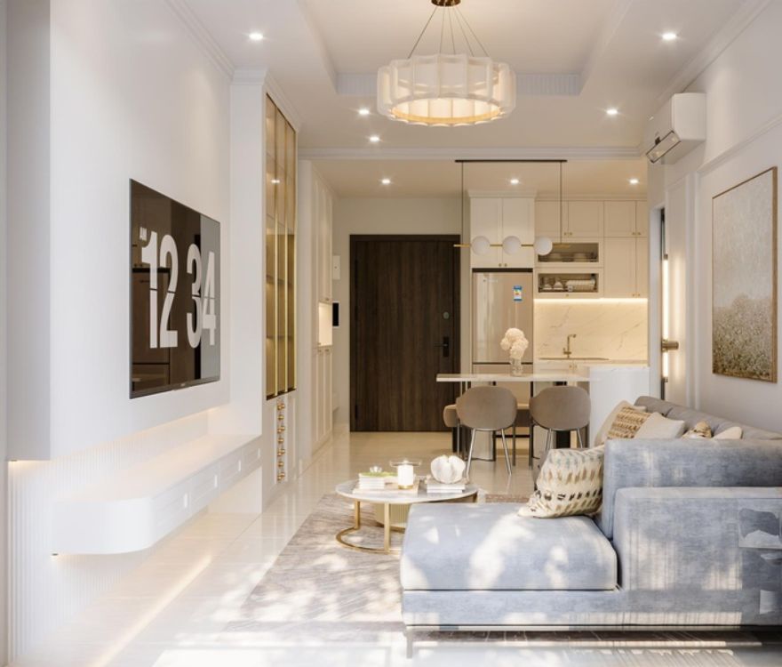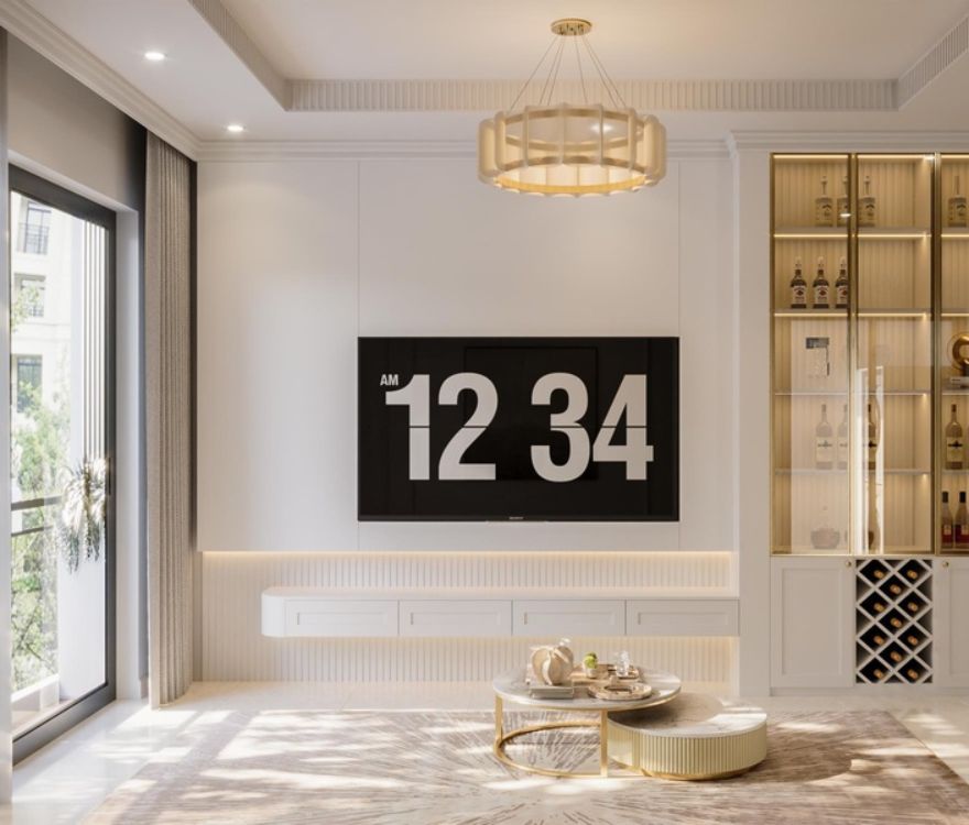 Các chi tiết phào chỉ được tiết chế, chạy mảnh và đều, đủ tạo chiều sâu cổ điển nhưng không làm không gian nặng nề. Bố cục được sắp xếp theo trật tự rõ ràng, nhấn mạnh trục thẳng và tỷ lệ cân xứng, mang lại cảm giác ngăn nắp và ổn định trong sinh hoạt hằng ngày. Ánh sáng tự nhiên được dẫn sâu, kết hợp đèn ánh vàng trung tính để giữ sự ấm áp mà không làm giảm tính thanh khiết của tổng thể.