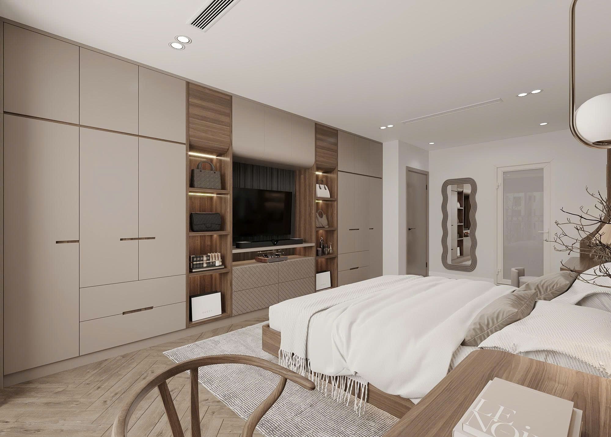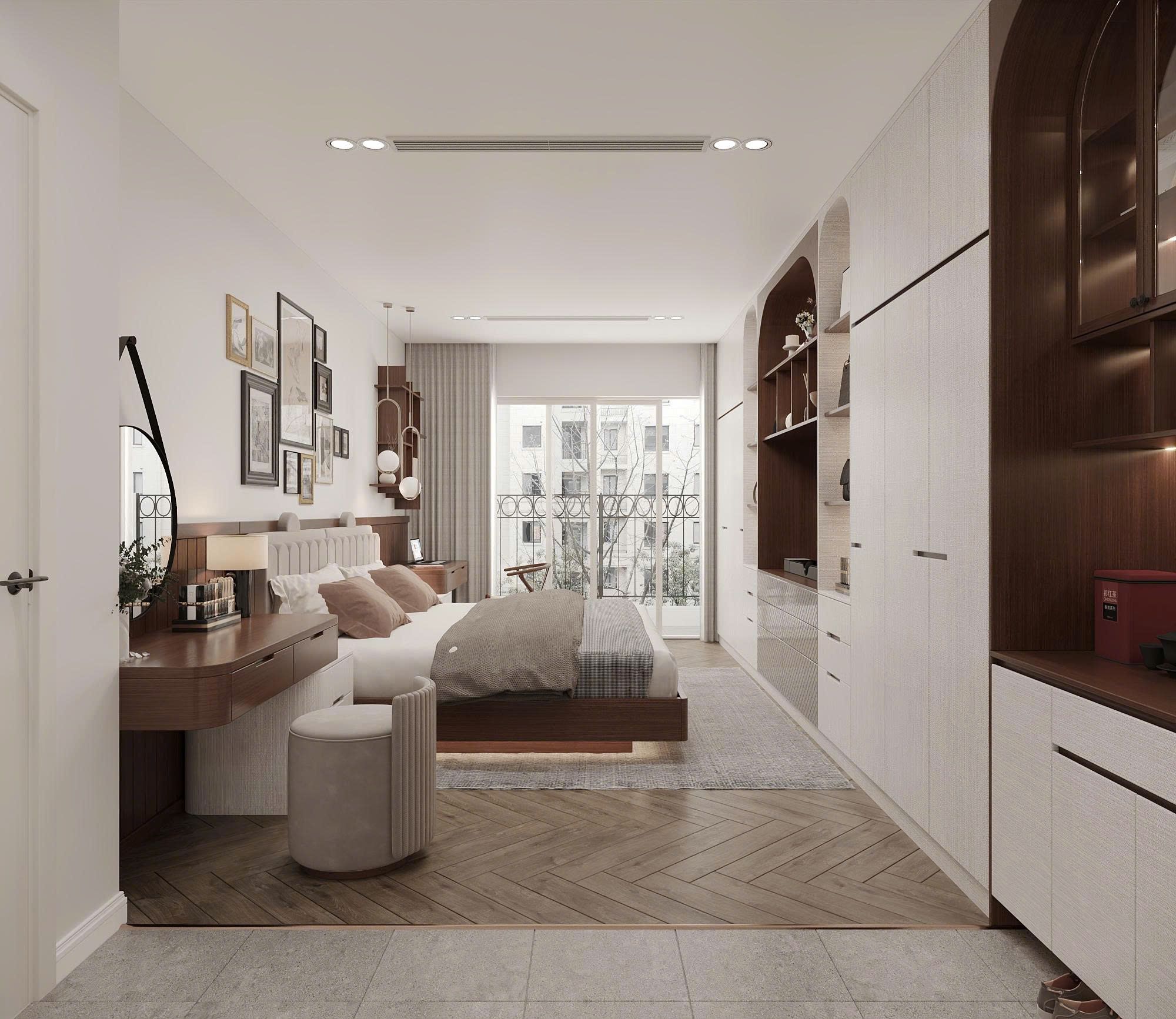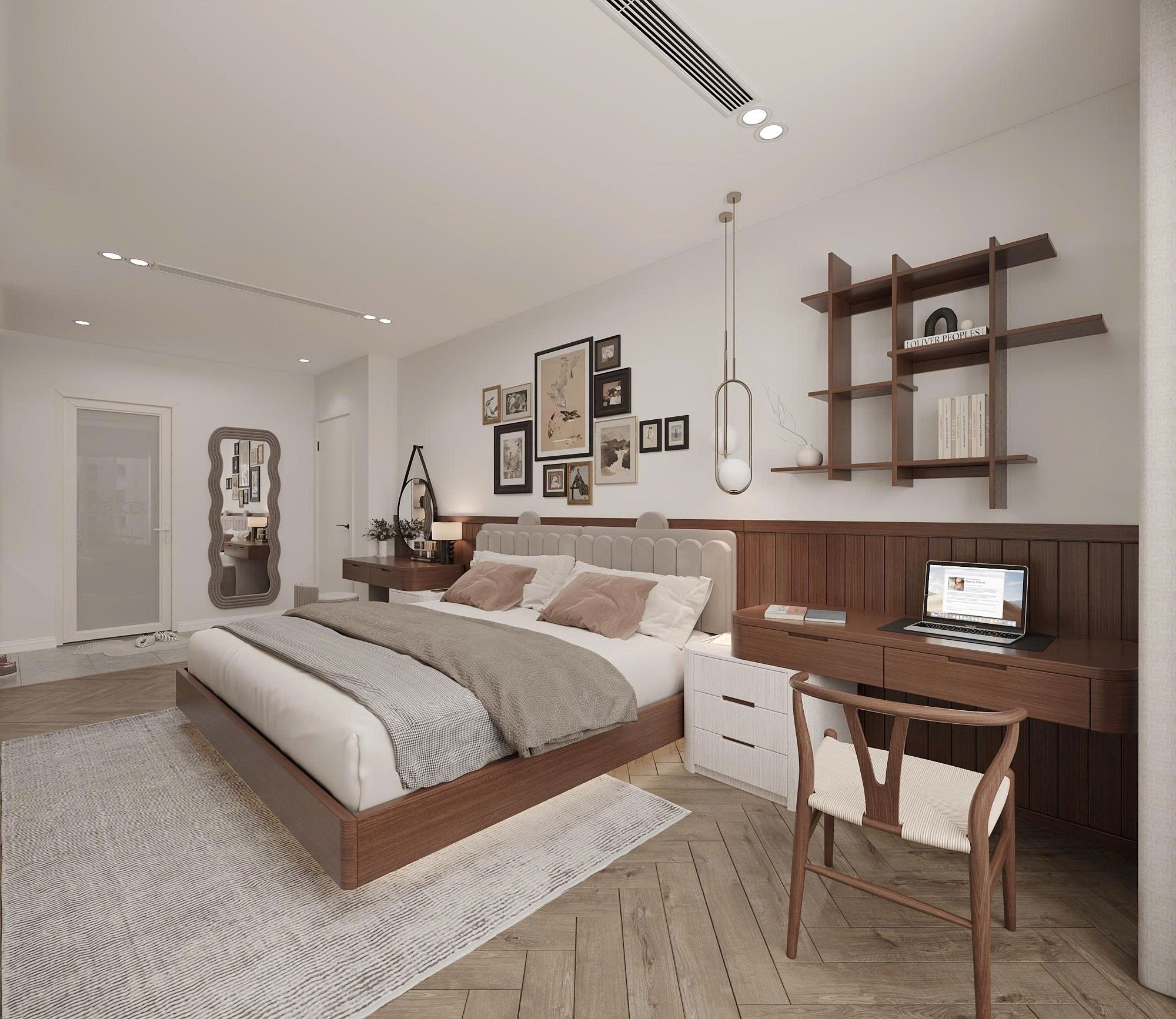 Phòng ngủ được thiết kế với tường trang trí dạng vòm, tạo điểm nhấn độc đáo và mềm mại cho không gian. Tủ quần áo không chỉ làm nhiệm vụ lưu trữ mà còn được sử dụng như một vách ngăn giữa phòng khách và phòng ngủ, đảm bảo sự riêng tư mà vẫn tiết kiệm diện tích. Hệ tủ để đồ và bàn làm việc được đặt cạnh cửa sổ, mang lại ánh sáng tự nhiên và không gian làm việc thoải mái. Tranh trang trí hình cô gái trên giường ngủ không chỉ đẹp mắt mà còn tạo thêm phong cách và cá tính cho phòng ngủ.