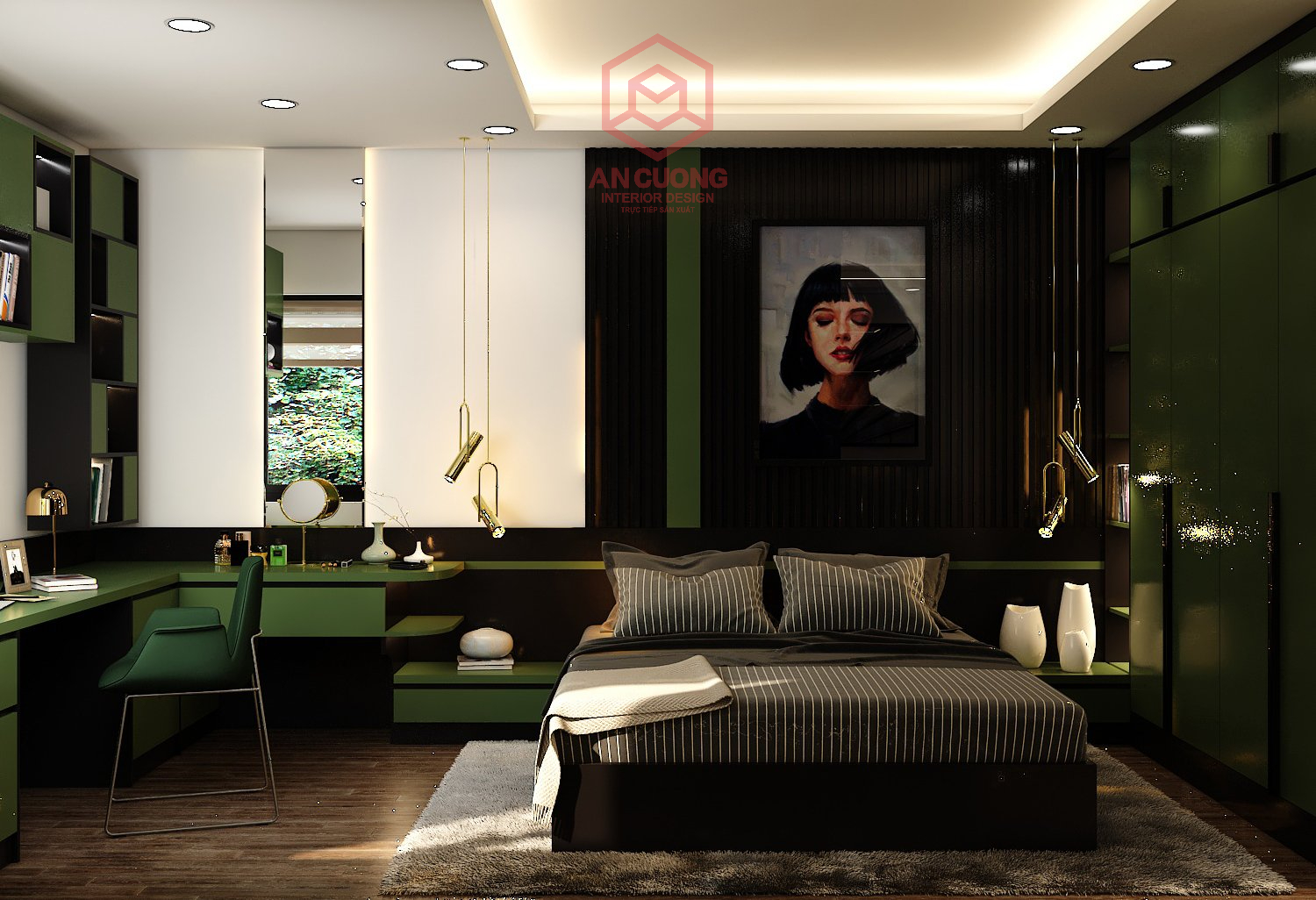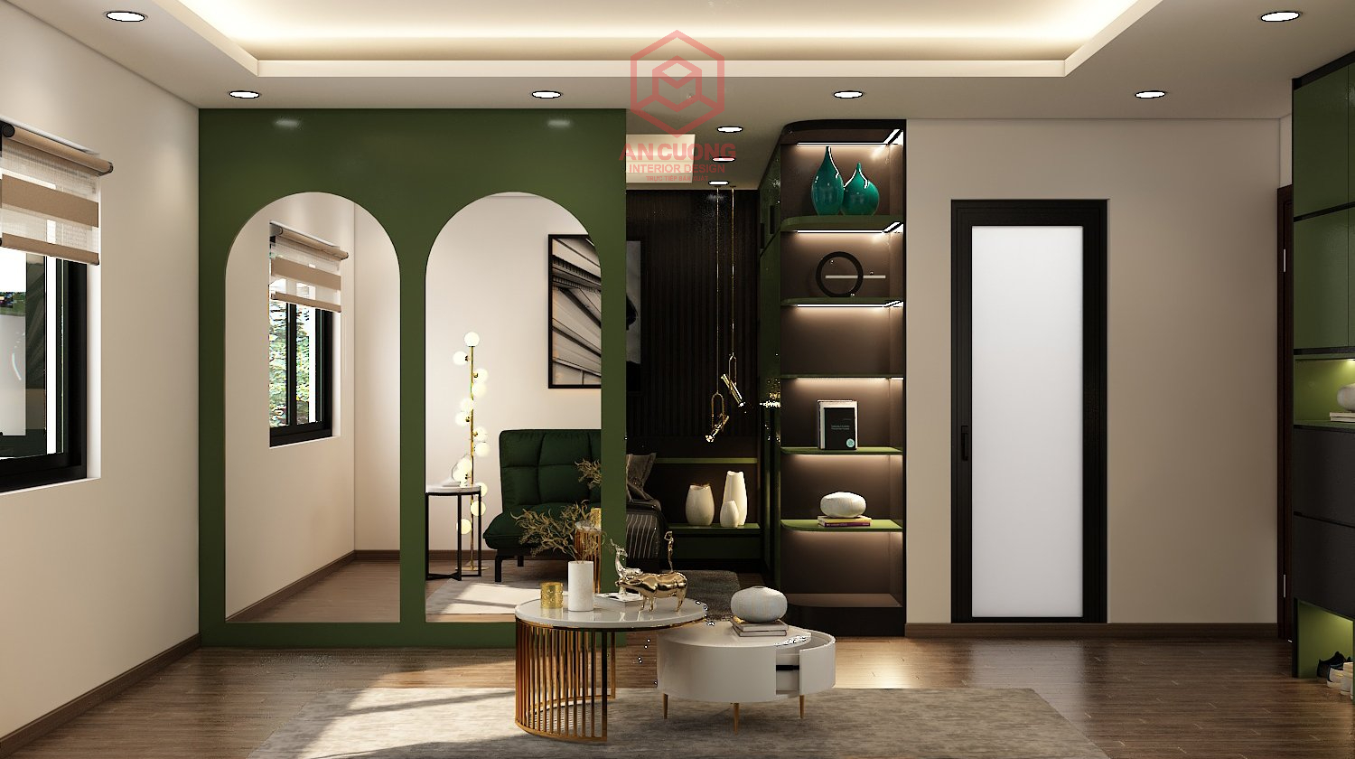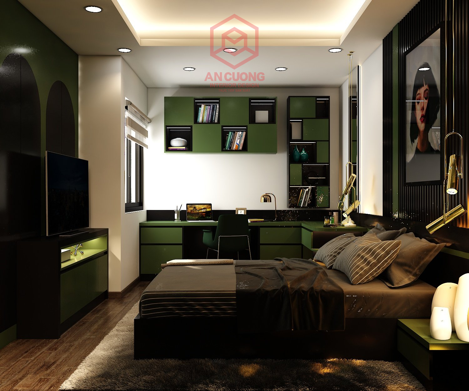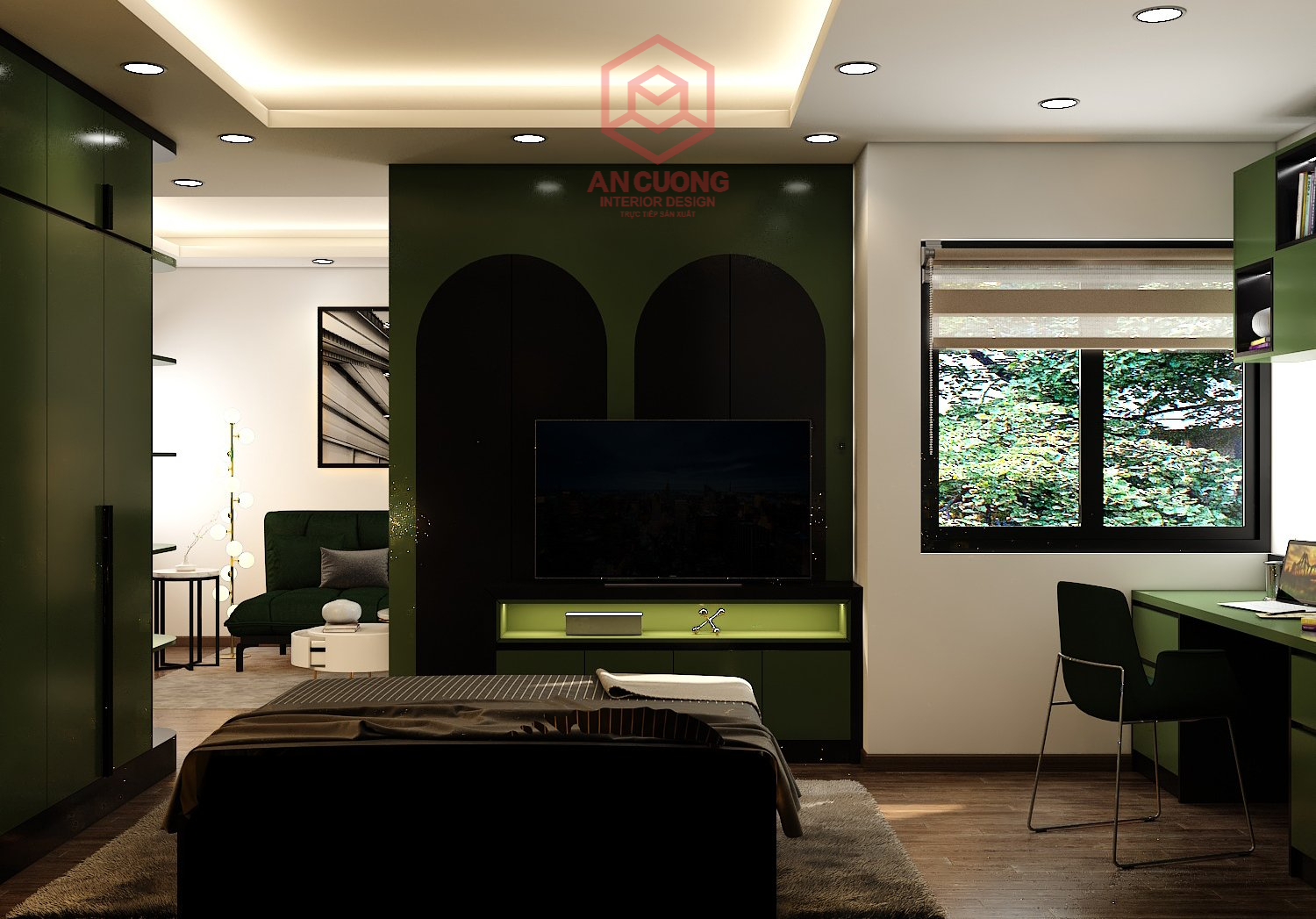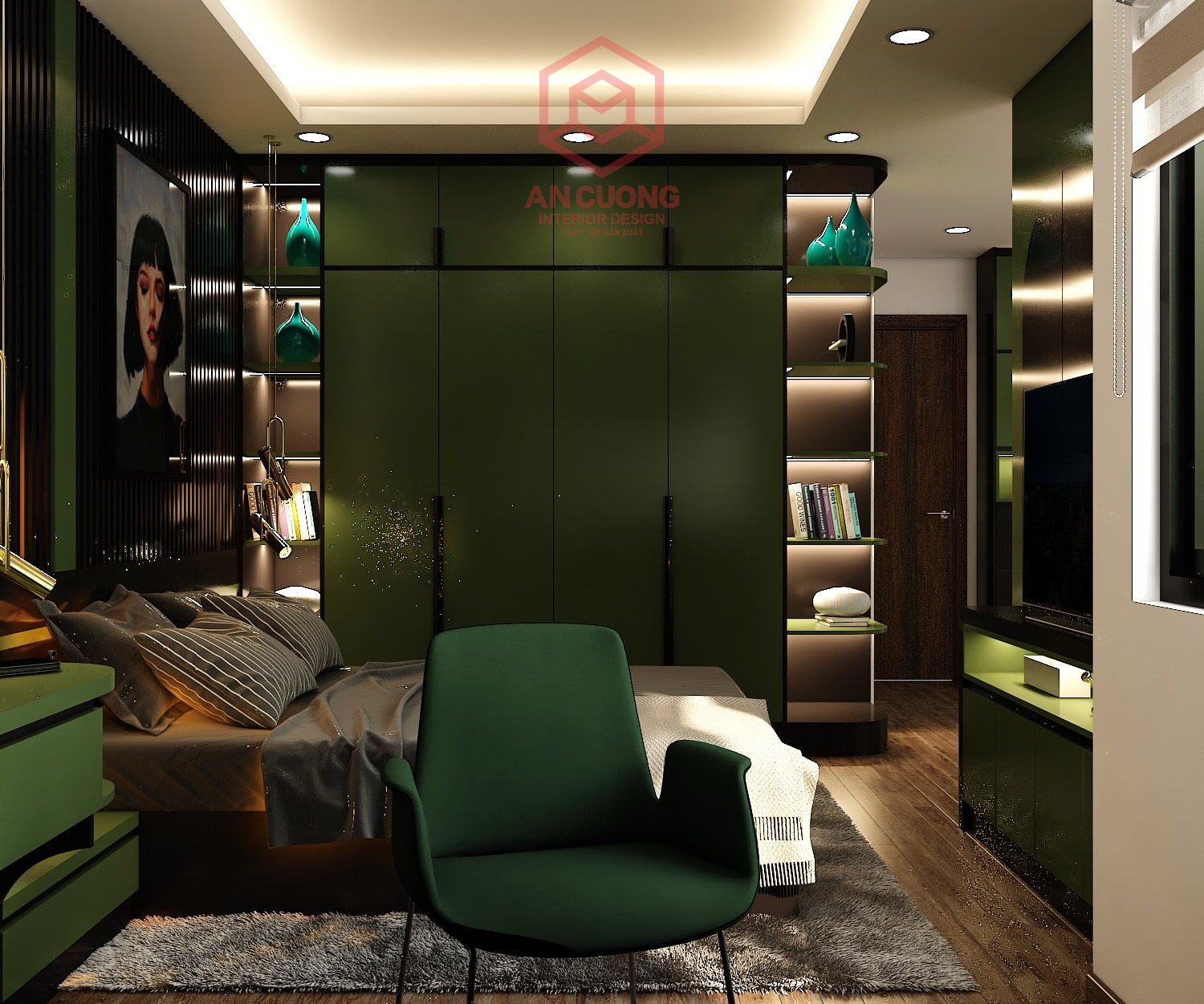 Căn chung cư nhỏ với thiết kế hiện đại này không chỉ mang lại không gian sống tiện nghi mà còn là một tác phẩm nghệ thuật đầy sáng tạo. Màu sắc xanh lá đậm và đen kết hợp hài hòa, tạo nên sự sang trọng và ấm cúng. Hãy đến với Kiến Trúc Nội Thất An Cường để trải nghiệm sự khác biệt trong từng chi tiết thiết kế và tạo nên không gian sống lý tưởng cho riêng mình.