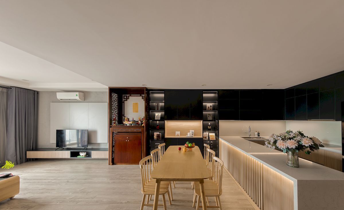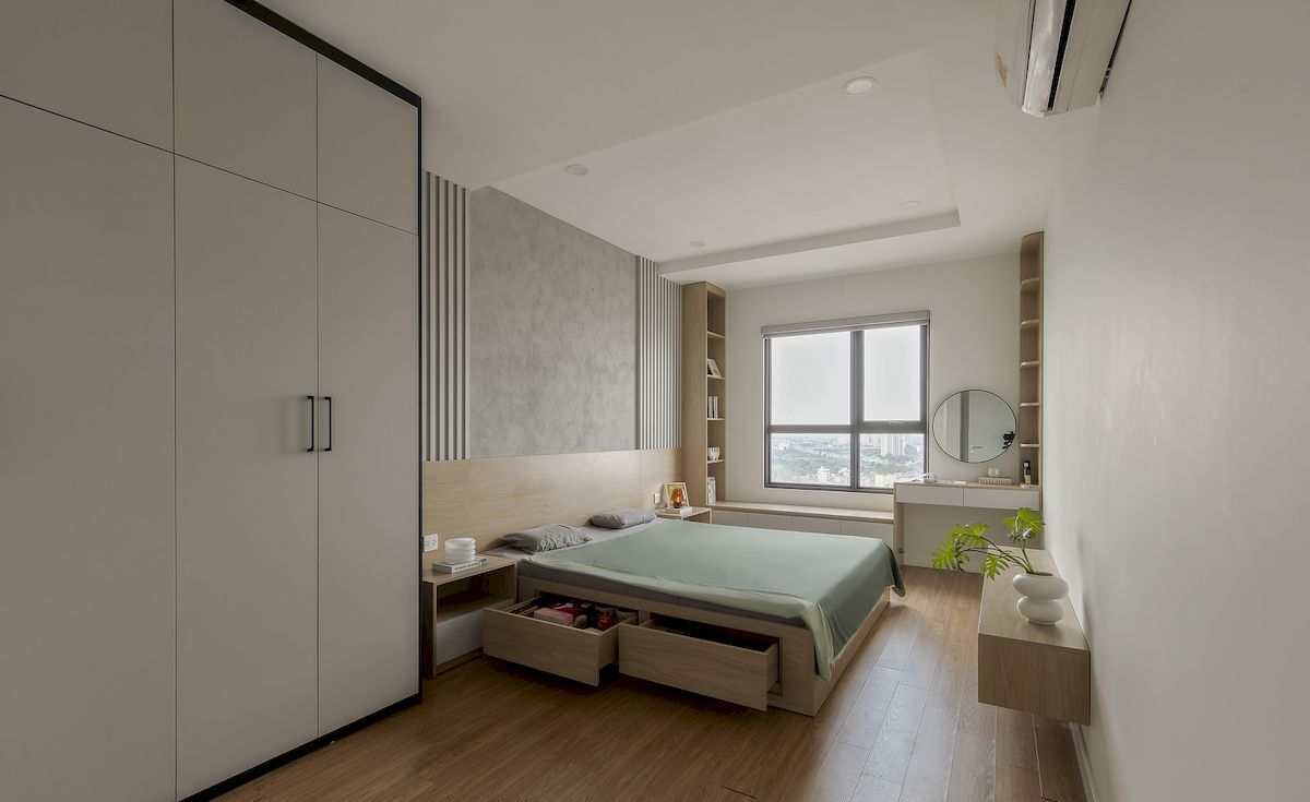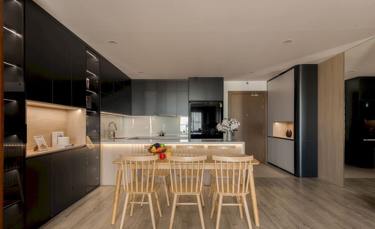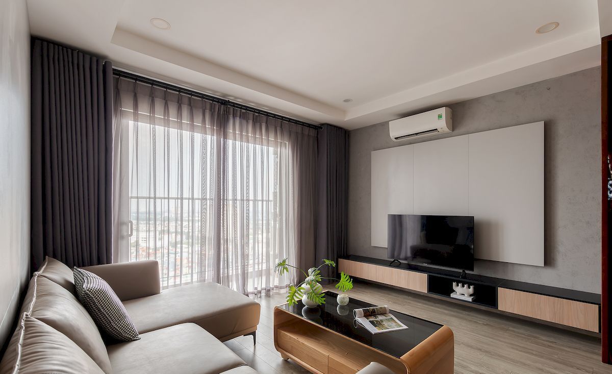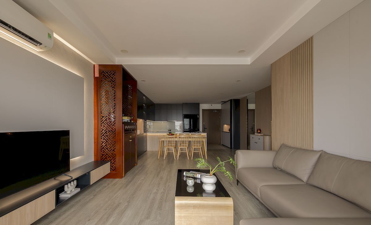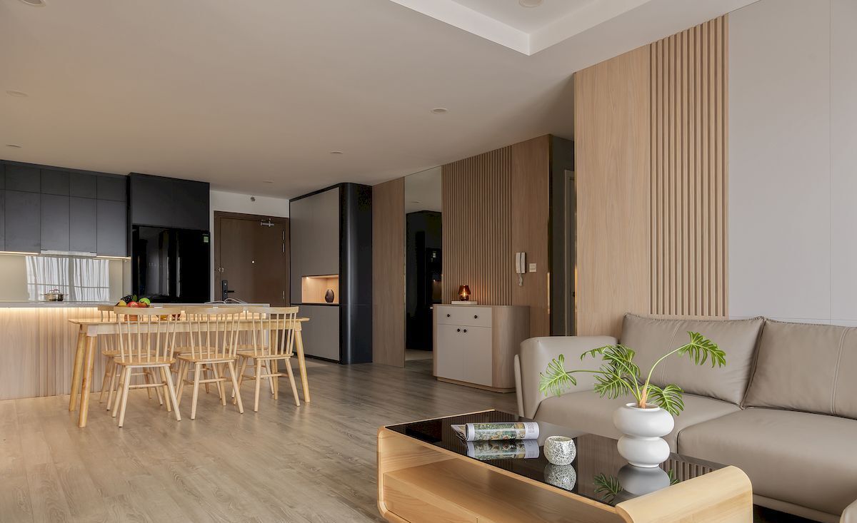 Phong cách chủ đạo hướng đến sự hiện đại, trẻ trung với gam màu trung tính kết hợp vật liệu gỗ MDF chống ẩm, đá nhân tạo và phụ kiện cao cấp. Hệ tủ bếp thiết kế kịch trần tăng không gian lưu trữ, phòng khách bố trí gọn gàng với vách trang trí và kệ tivi đồng bộ, các phòng ngủ được cá nhân hóa theo nhu cầu từng thành viên, đảm bảo sự riêng tư và thoải mái.