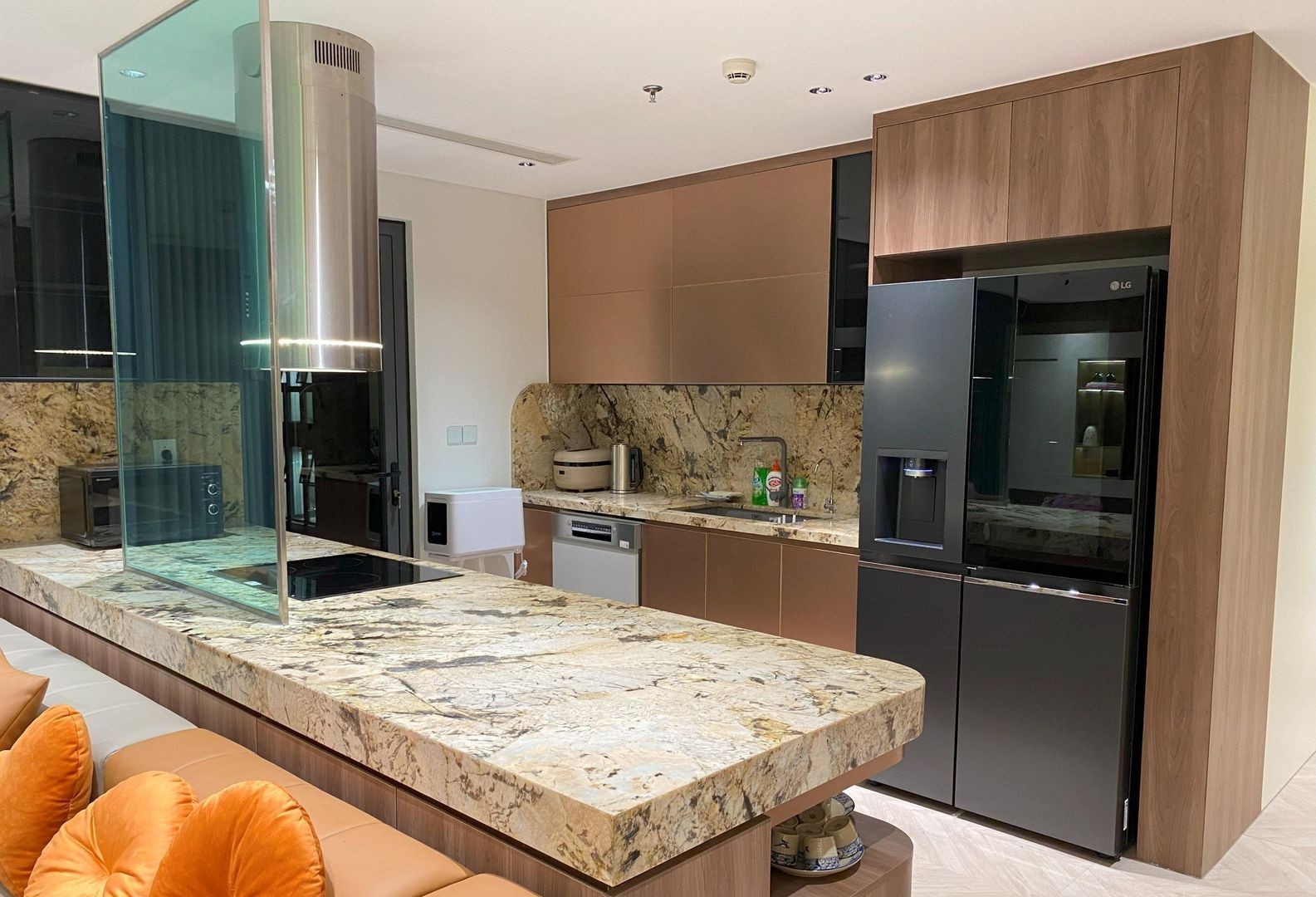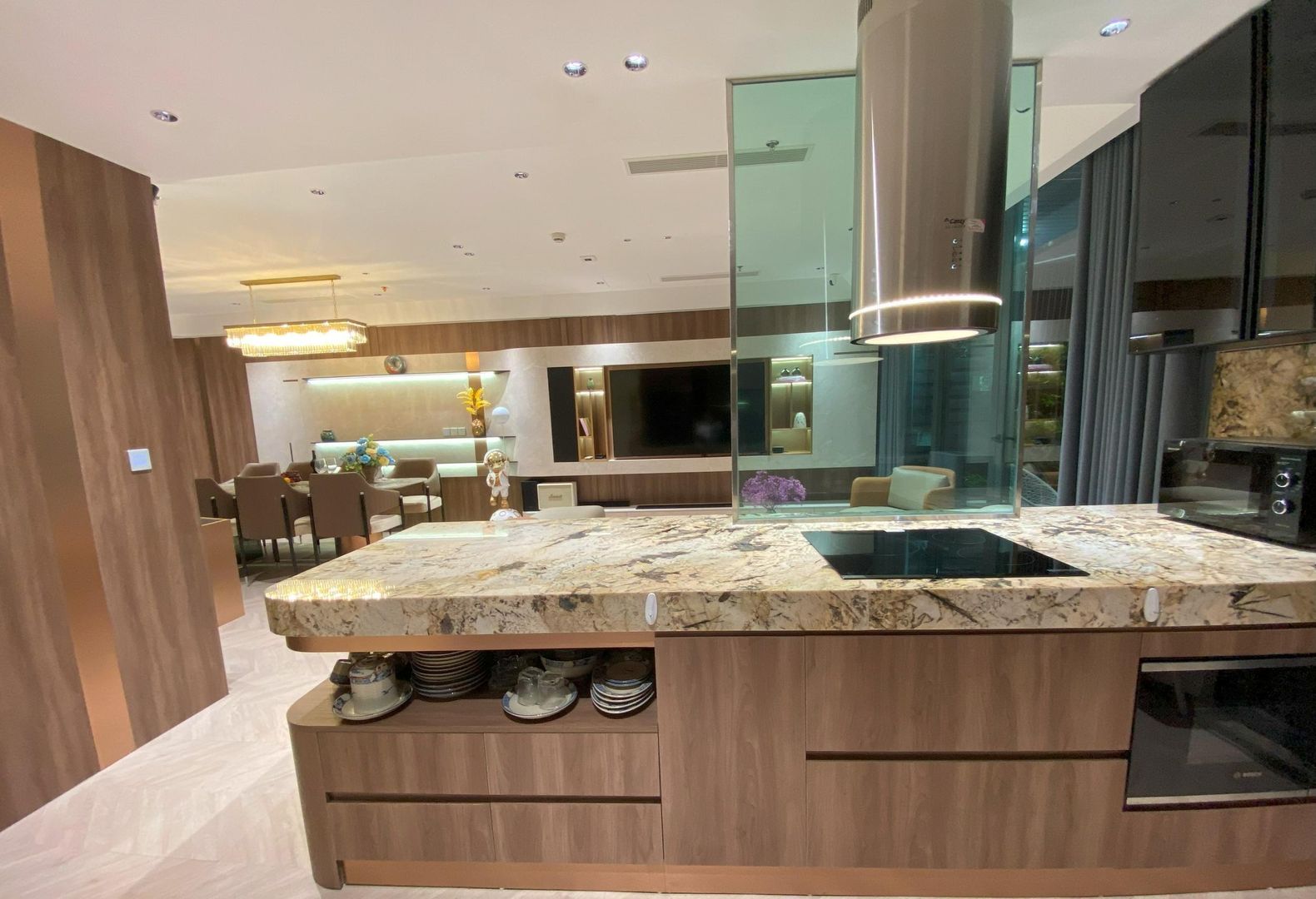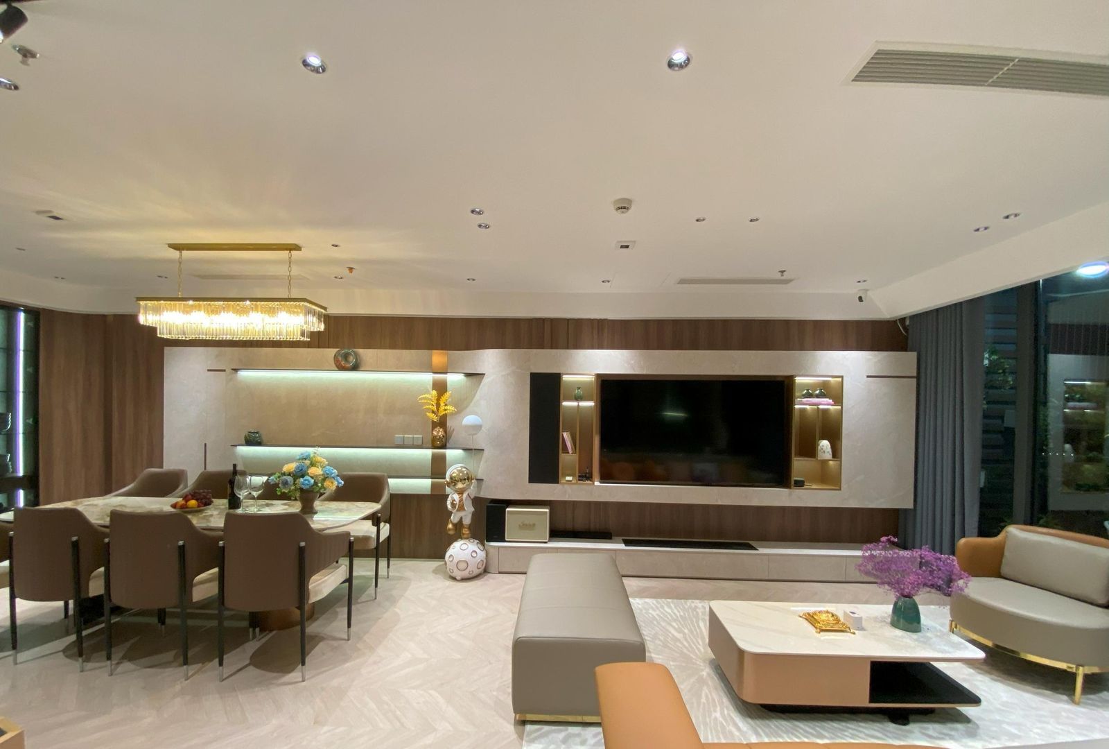 Thi công nội thất căn hộ chung cư 97m² tại Le Grand Jardin được triển khai theo phong cách hiện đại sang trọng, chú trọng sự cân bằng giữa thẩm mỹ và công năng sử dụng. Với diện tích 97m², mặt bằng được tối ưu khoa học, tạo nên không gian sinh hoạt chung rộng rãi, liền mạch giữa phòng khách – bếp – khu vực ăn uống, mang lại cảm giác thông thoáng và ấm cúng cho cả gia đình.