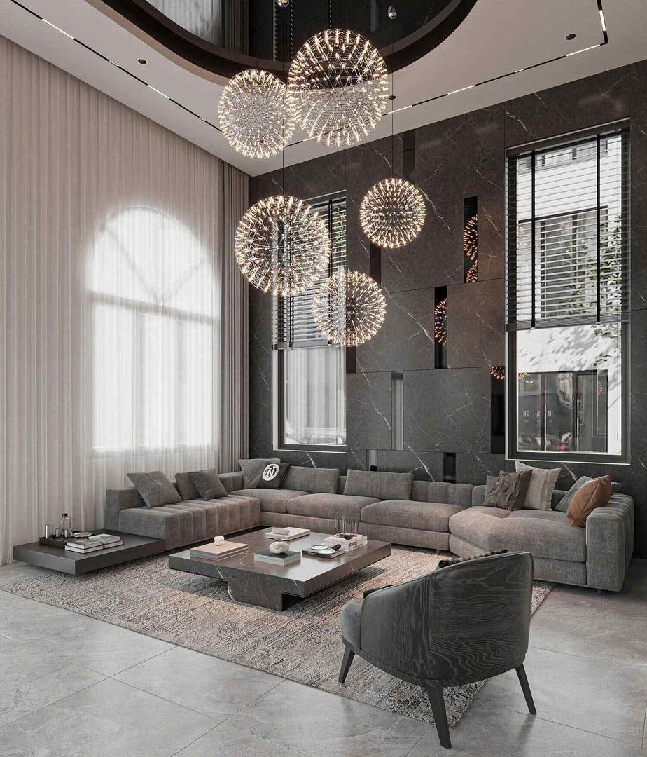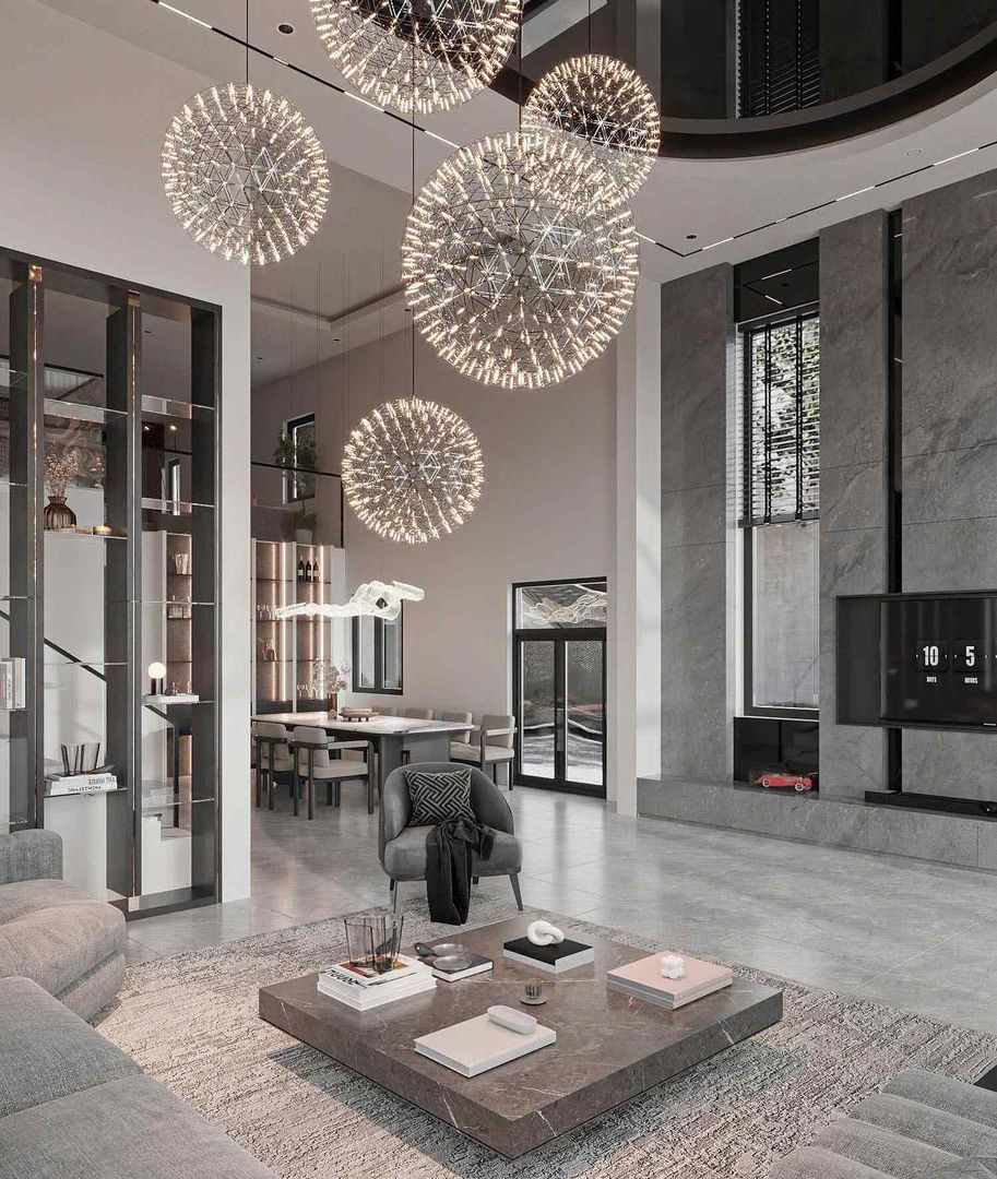 Ngay từ bước chân đầu tiên vào biệt thự, phòng khách đã tạo ấn tượng mạnh mẽ nhờ trần cao thoáng đãng và hệ đèn chùm nghệ thuật hình khối cầu độc đáo. Ánh sáng từ những chiếc đèn pha lê tỏa ra như những chùm pháo hoa, vừa sang trọng vừa tinh tế.