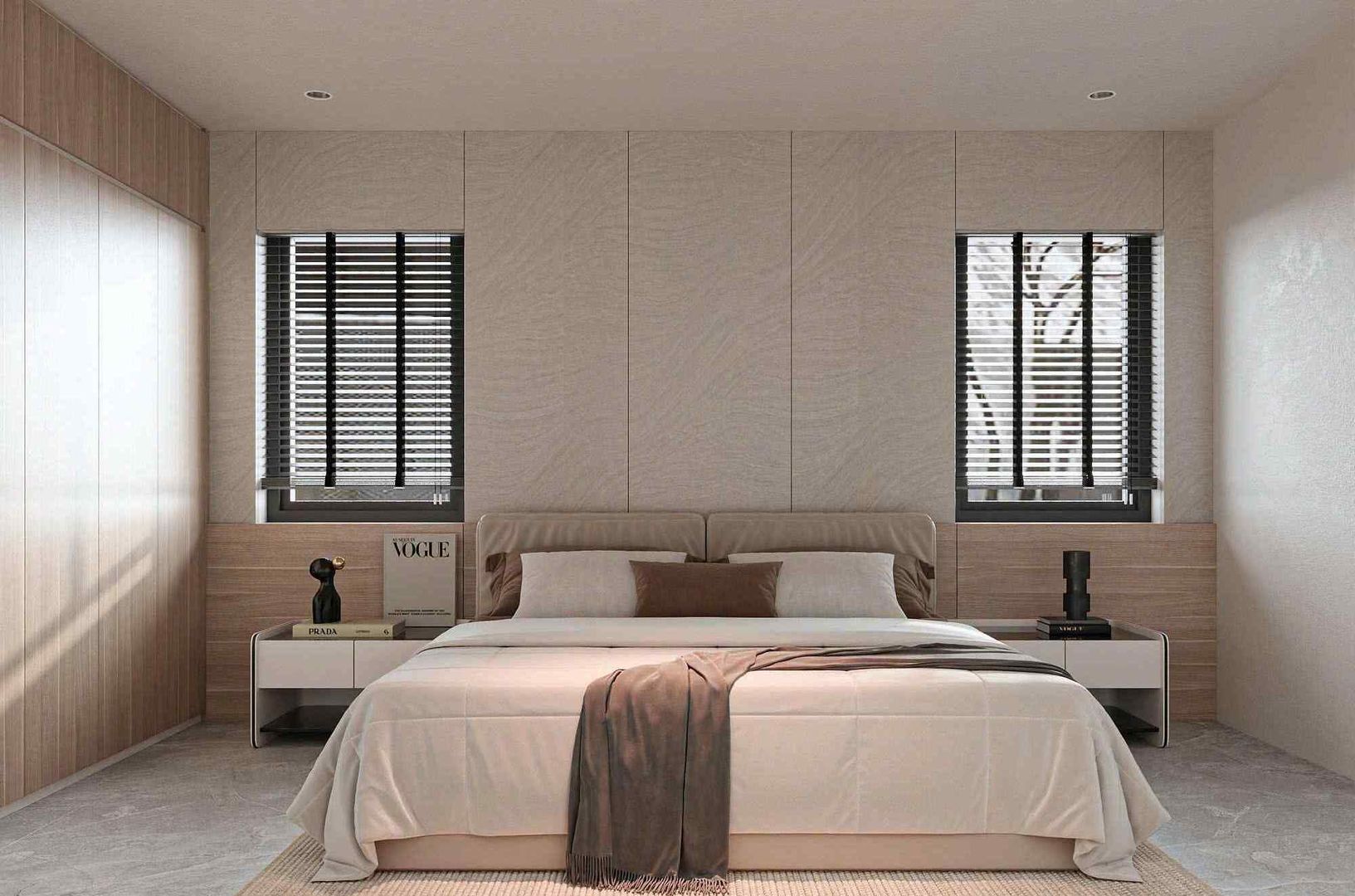 Phòng ngủ master nổi bật với gam màu trung tính nhẹ nhàng, kết hợp cùng giường bọc nệm lớn và hệ tủ âm tường tinh gọn. Không gian được bố trí tối ưu ánh sáng tự nhiên từ cửa sổ lớn, đồng thời vẫn đảm bảo sự riêng tư cần thiết. Điểm nhấn trong phòng ngủ chính là cách kết hợp giữa vật liệu gỗ và vải nỉ, mang đến sự ấm áp, thư giãn.