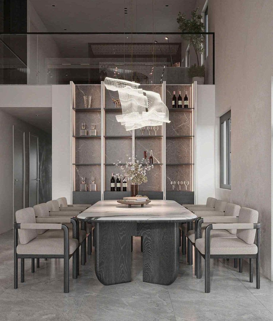 Phòng ăn được bố trí liền kề với phòng khách, với bộ bàn ăn dài bằng gỗ tự nhiên kết hợp ghế bọc nệm sang trọng. Điểm nhấn nổi bật trong khu vực này chính là chiếc đèn thả trần với thiết kế mềm mại, tựa như một dải lụa bay bổng, vừa hiện đại vừa nghệ thuật.