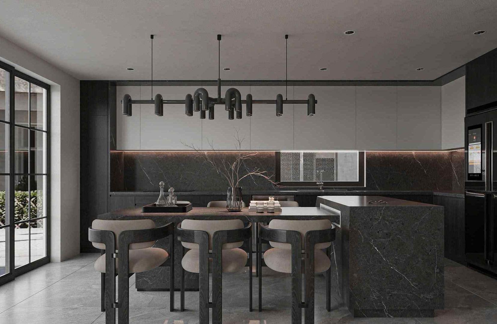 Tủ bếp mang phong cách tối giản với thiết kế chữ L kết hợp đảo bếp hiện đại. Bề mặt đá granite màu tối cùng hệ tủ bếp phẳng, không tay nắm, mang đến sự gọn gàng và tiện dụng. Khu vực này được thiết kế nhiều cửa kính lớn, giúp ánh sáng tự nhiên tràn ngập không gian, đồng thời tạo sự kết nối giữa trong và ngoài nhà.