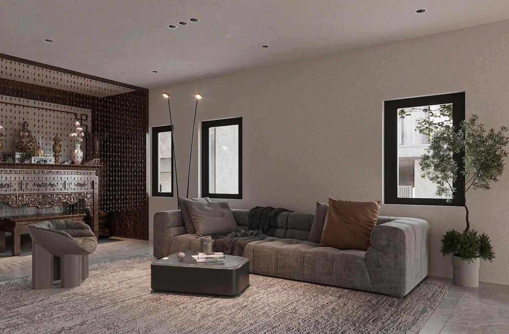 Tone màu chủ đạo của phòng khách là xám trung tính, kết hợp cùng đá ốp tường vân mây tự nhiên, tạo nên cảm giác mạnh mẽ và hiện đại. Bộ sofa lớn dạng chữ U được lựa chọn để tối ưu hóa sự thoải mái và kết nối giữa các thành viên trong gia đình. Khu vực bàn trà thấp bằng đá kết hợp thảm trải sàn lông ngắn mang lại sự ấm áp, cân bằng giữa yếu tố hiện đại và sự gần gũi trong sinh hoạt.