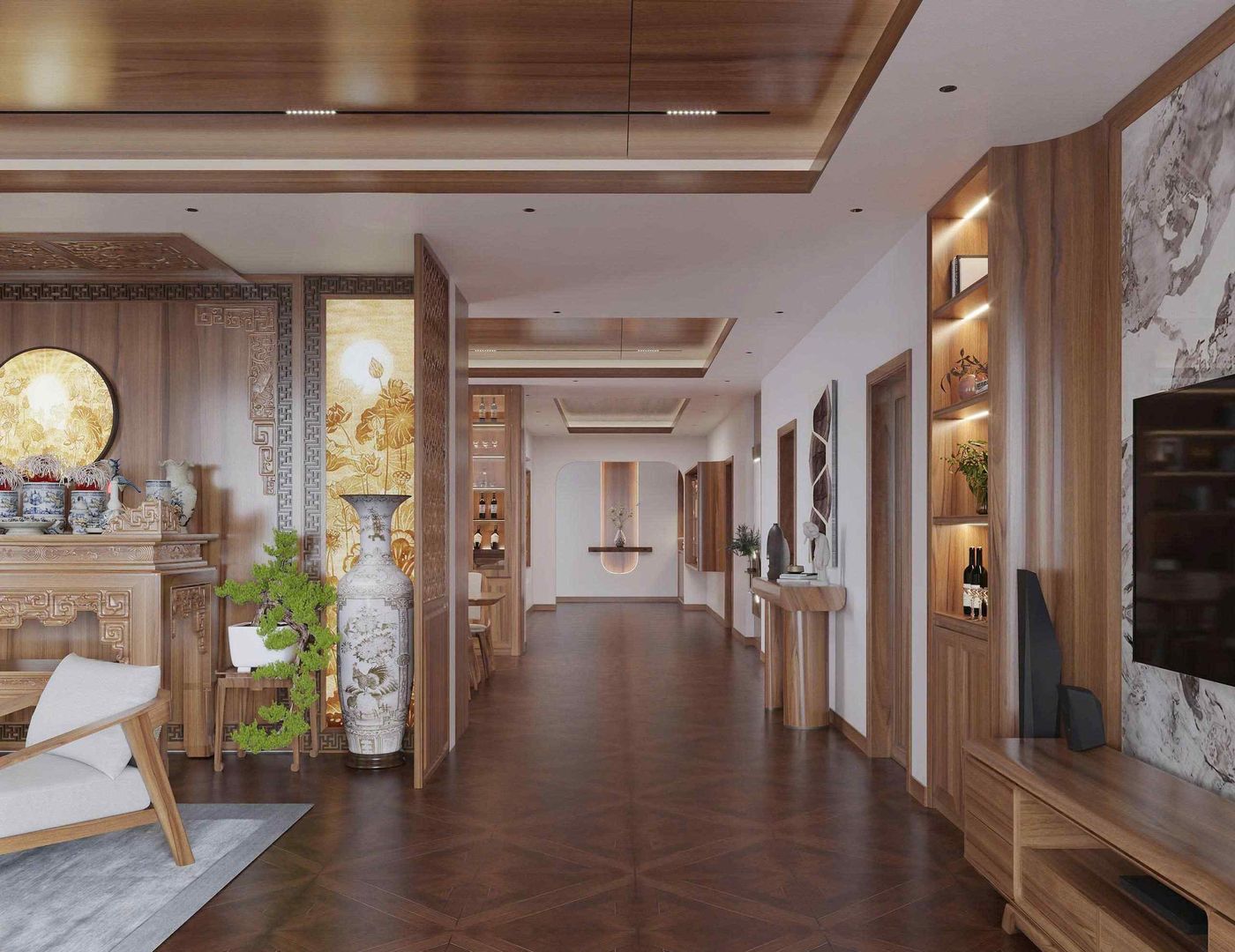 Hành lang trong biệt thự được thiết kế rộng rãi, kết hợp hệ thống kệ tủ âm tường và các chi tiết trang trí tinh tế. Đèn hắt tường và tiểu cảnh nhỏ tạo cảm giác sang trọng và ấm áp khi di chuyển trong nhà.