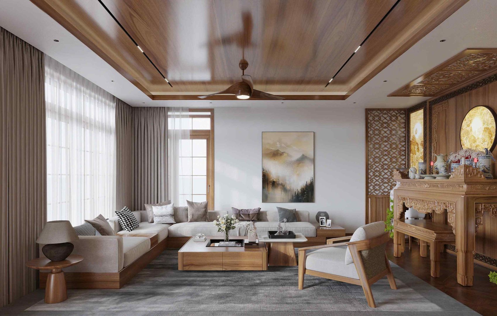 Trong phòng khách là không gian thờ được bố trí trang nghiêm. Bàn thờ gỗ tự nhiên chạm khắc tinh xảo, kết hợp cùng hệ vách CNC và tranh kính nghệ thuật tạo nên sự sang trọng và linh thiêng. Đây là nơi gia chủ thể hiện sự tôn kính đối với tổ tiên, đồng thời cũng góp phần hoàn thiện nét đẹp truyền thống trong không gian sống hiện đại.