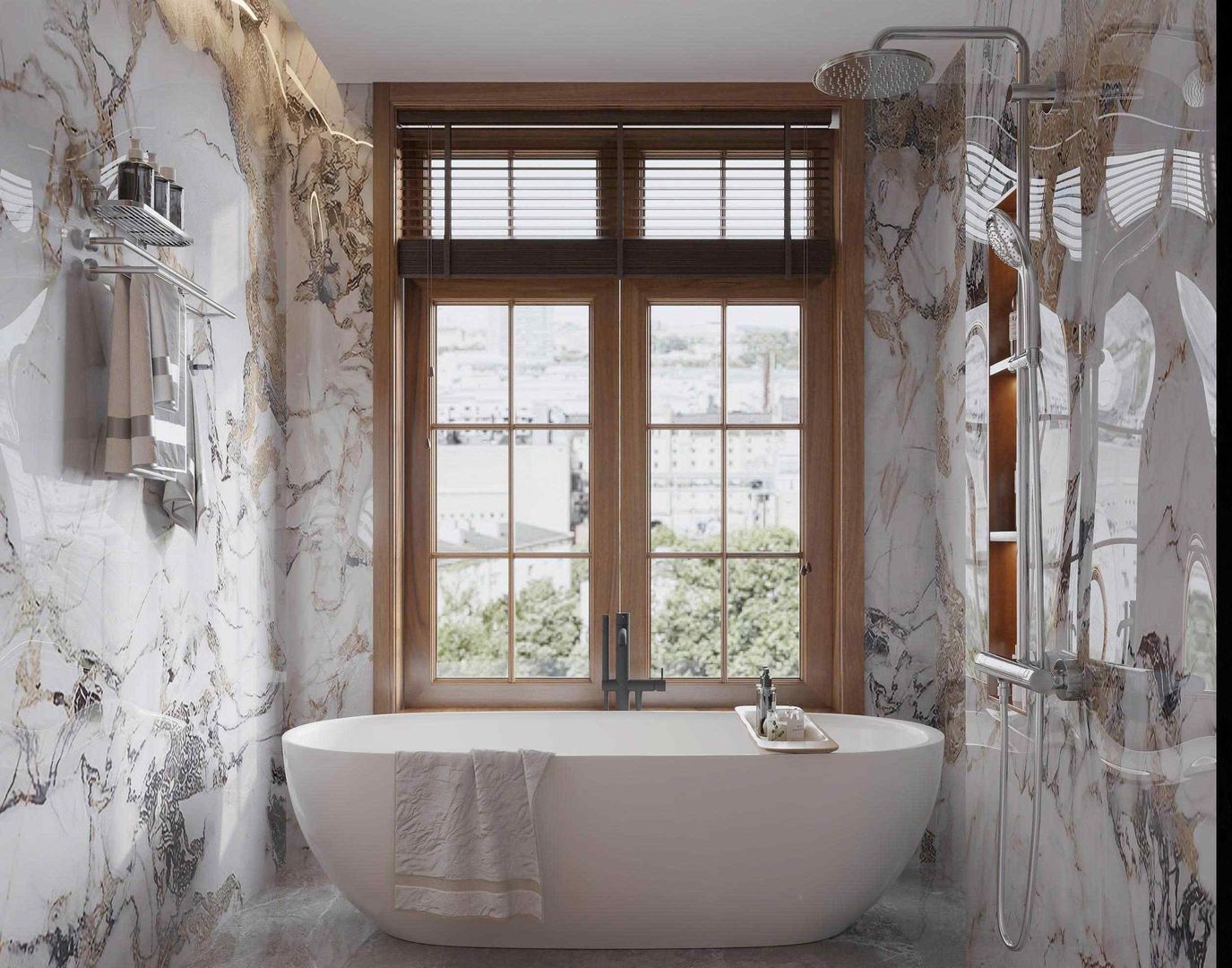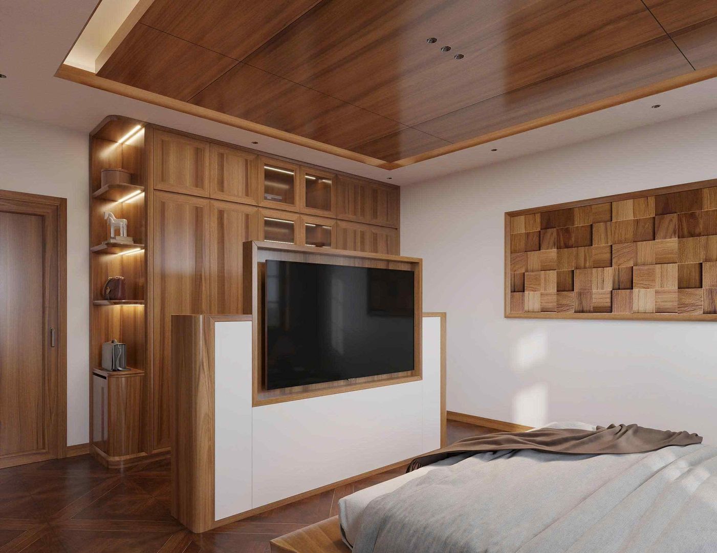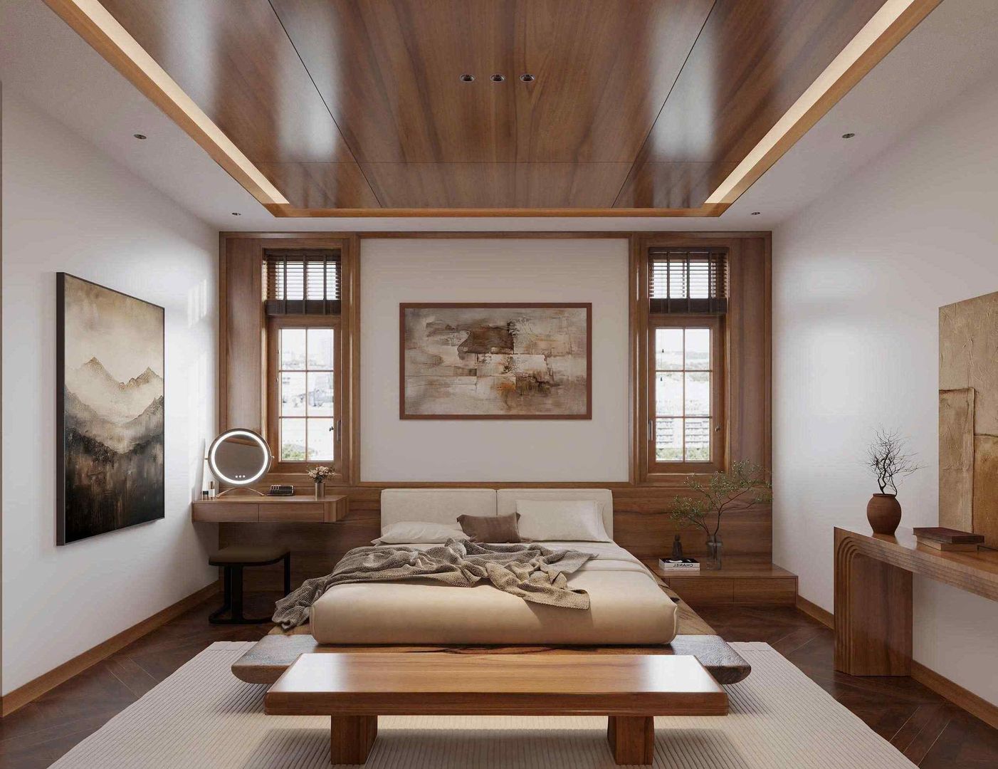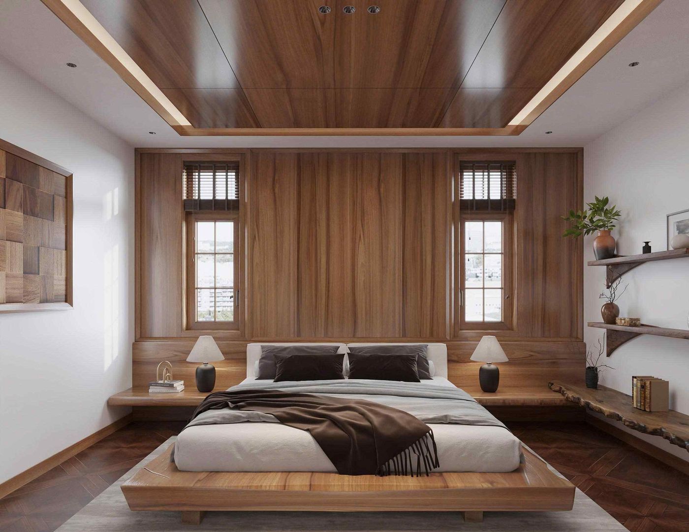 Phòng ngủ master: Diện tích rộng rãi, sử dụng gỗ tự nhiên trong toàn bộ giường, tủ quần áo và hệ thống ốp tường. Cửa kính lớn giúp đón ánh sáng tự nhiên, kết hợp cùng rèm voan tạo sự mềm mại. Nội thất bố trí cân đối, tạo cảm giác thư giãn tuyệt đối cho gia chủ.