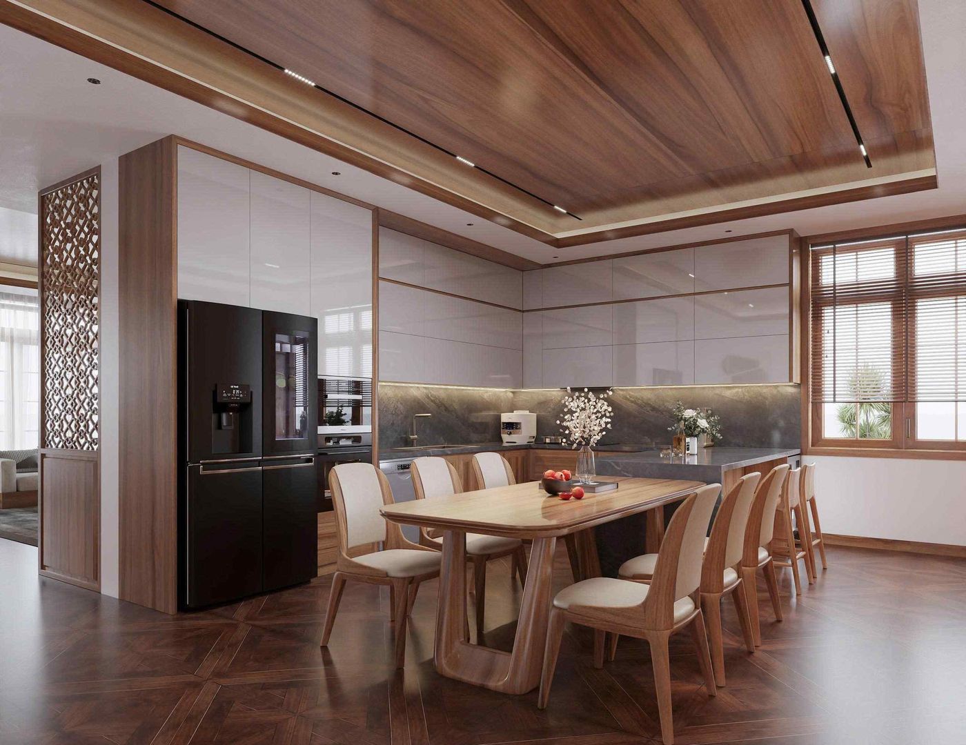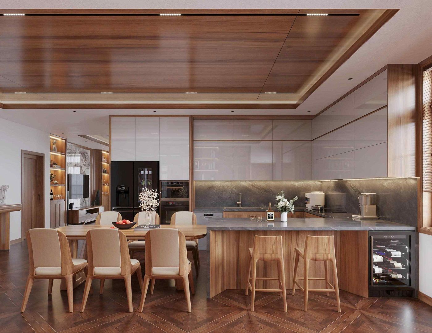 Phòng bếp và khu vực ăn uống được thiết kế mở, mang lại sự thông thoáng và tiện lợi trong sinh hoạt. Hệ tủ bếp chữ L kết hợp tủ kịch trần màu trắng bóng gương và gỗ tự nhiên giúp tận dụng tối đa diện tích, vừa tăng tính thẩm mỹ vừa đảm bảo công năng lưu trữ.