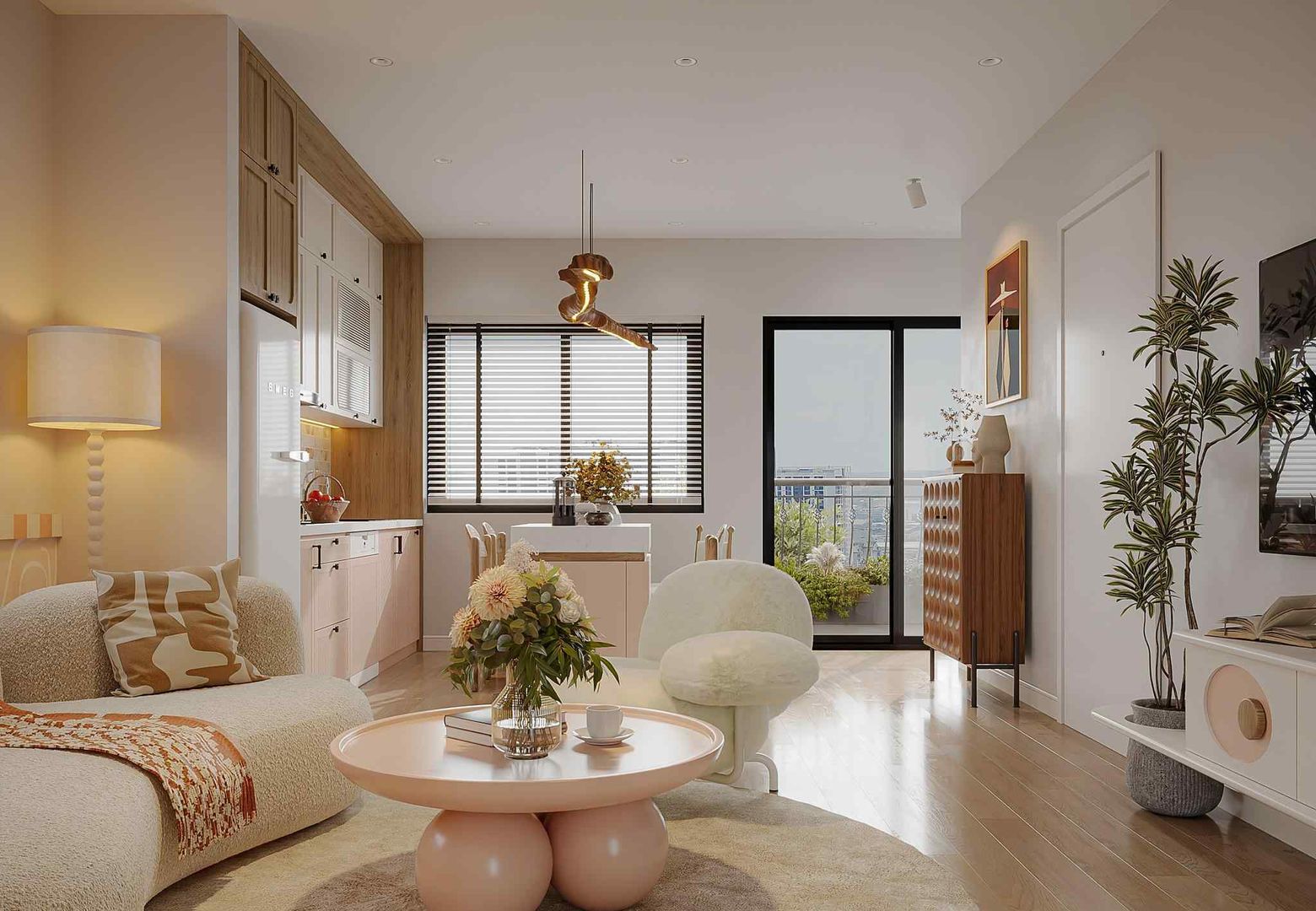 Phòng khách là nơi thể hiện trọn vẹn tinh thần Bắc Âu, sử dụng bảng màu be, hồng pastel nhẹ nhàng. Điểm nhấn chính đến từ: