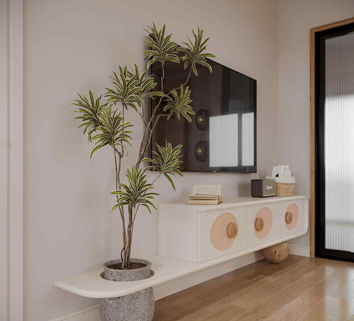 - Kệ bo cong + đèn LED hắt ấm tăng sự sang trọng và hiện đại.