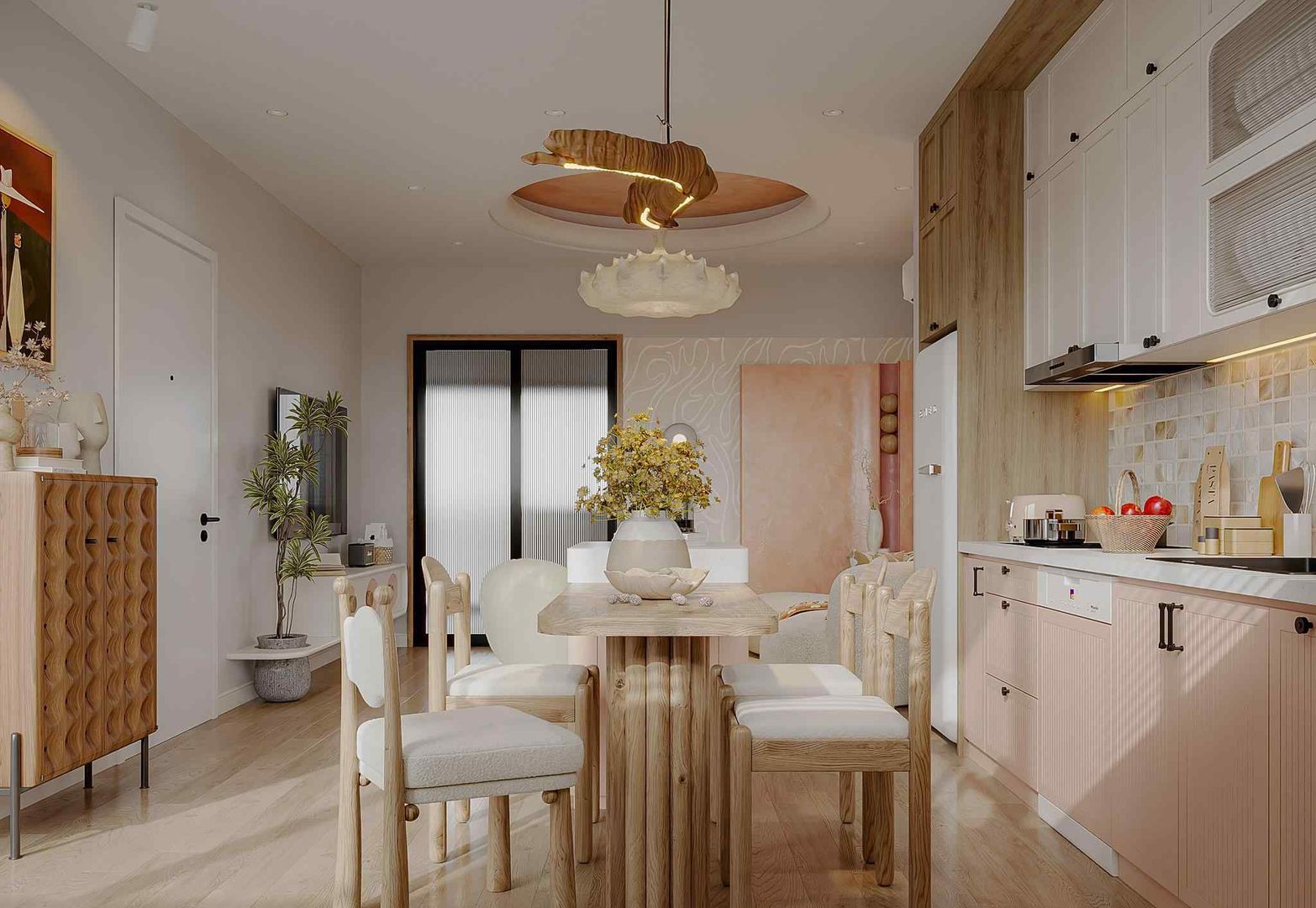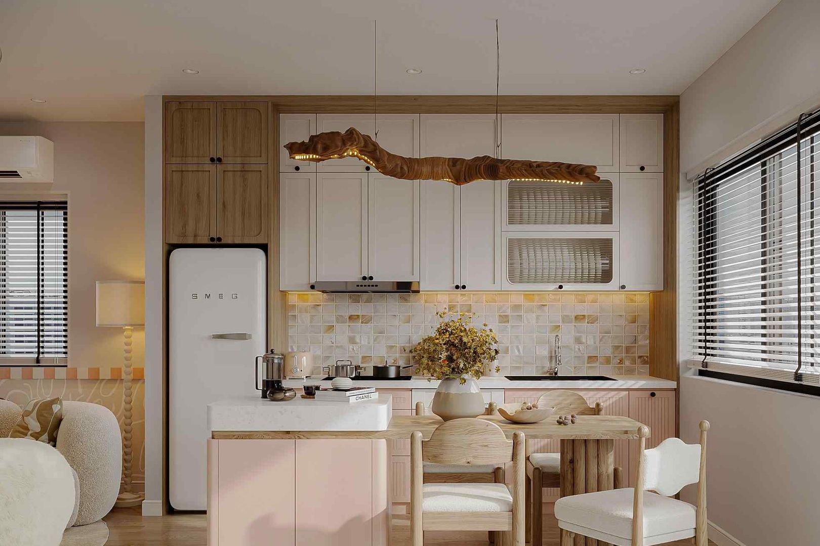 - Tối giản, thoáng đãng: Các mảng màu trắng, be, pastel giúp mở rộng thị giác, tạo sự dễ chịu cho toàn bộ căn hộ.