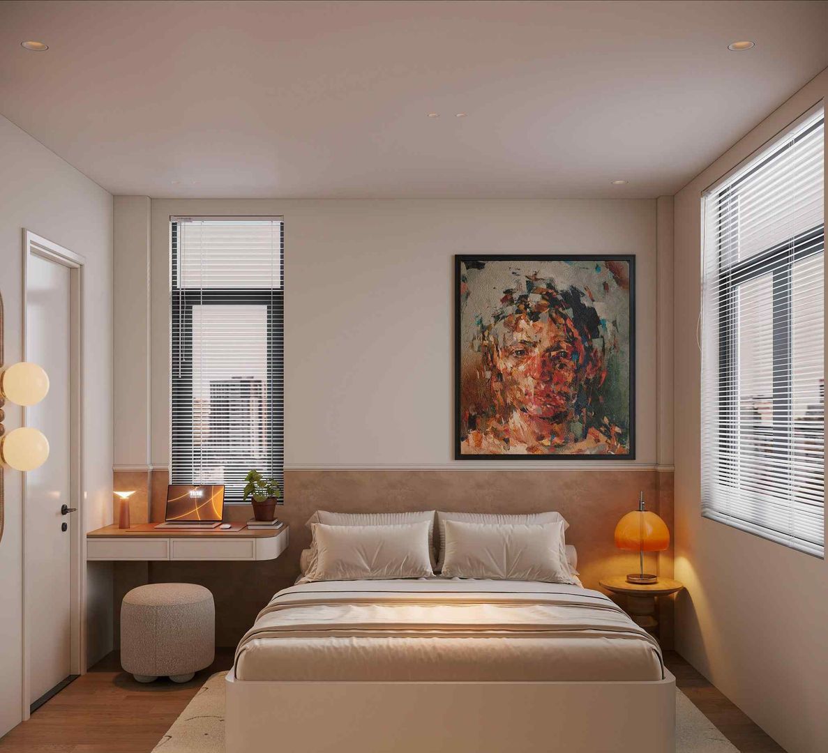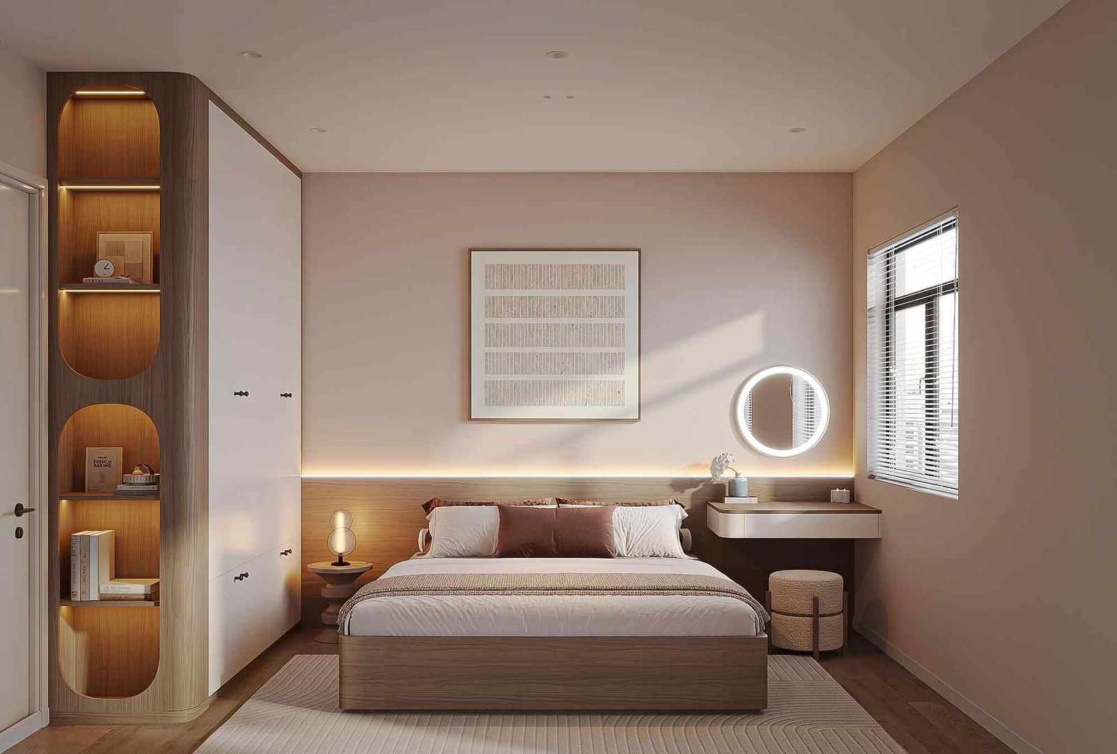 - Phòng ngủ master mang tông trắng – be – pastel để tạo cảm giác nhẹ nhàng, nữ tính và dễ chịu.