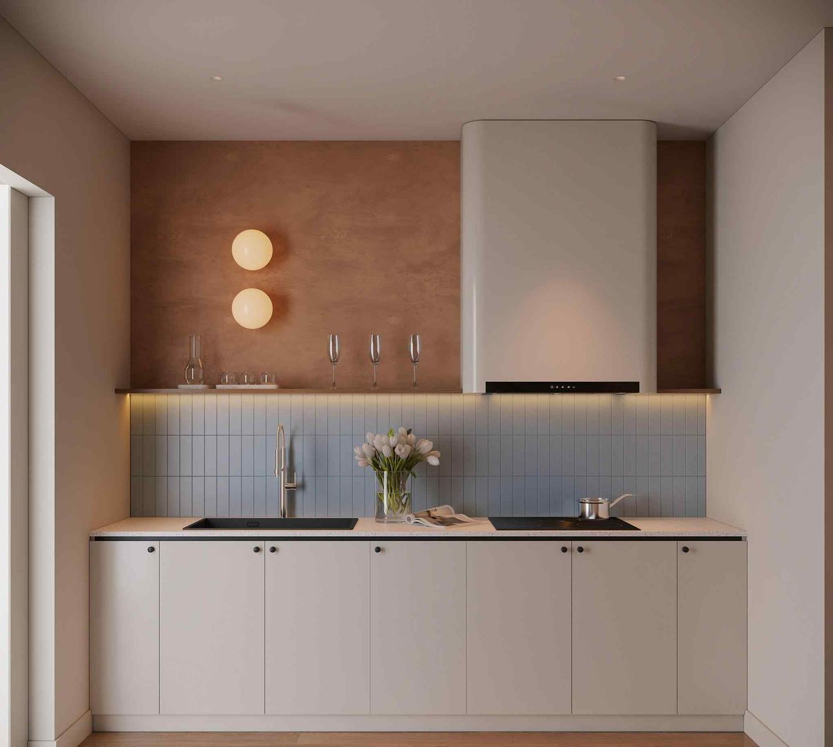 - Gạch ốp bếp màu kem tinh tế, dễ vệ sinh.