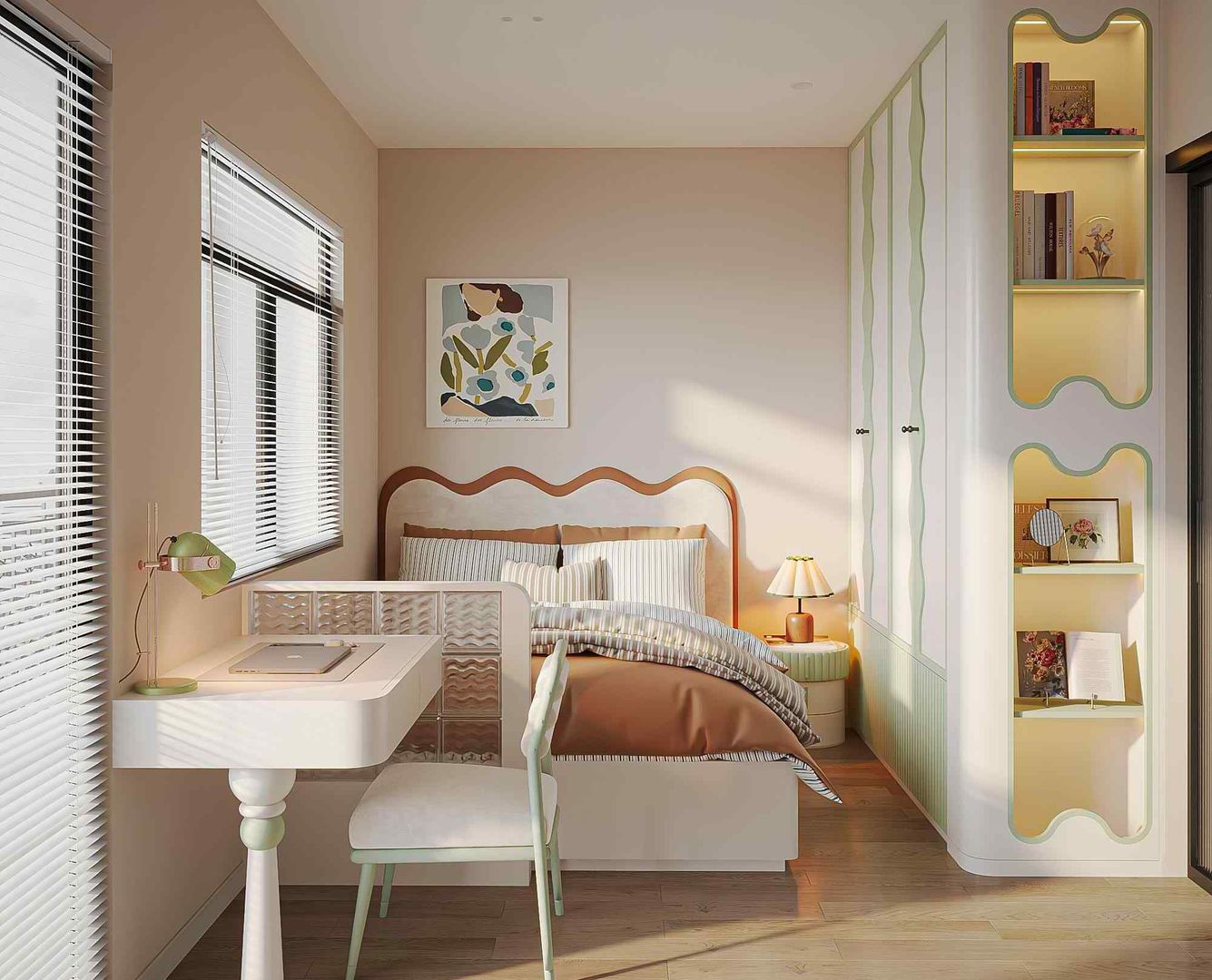 - Tiện nghi, giàu công năng: Đồ nội thất được thiết kế tinh gọn, ưu tiên đường nét cong mềm mại, ít chi tiết, giúp tối ưu diện tích mà vẫn đảm bảo tính thẩm mỹ.