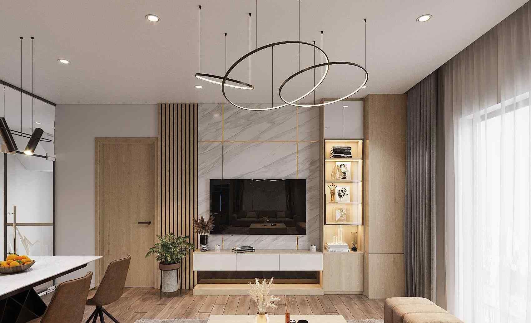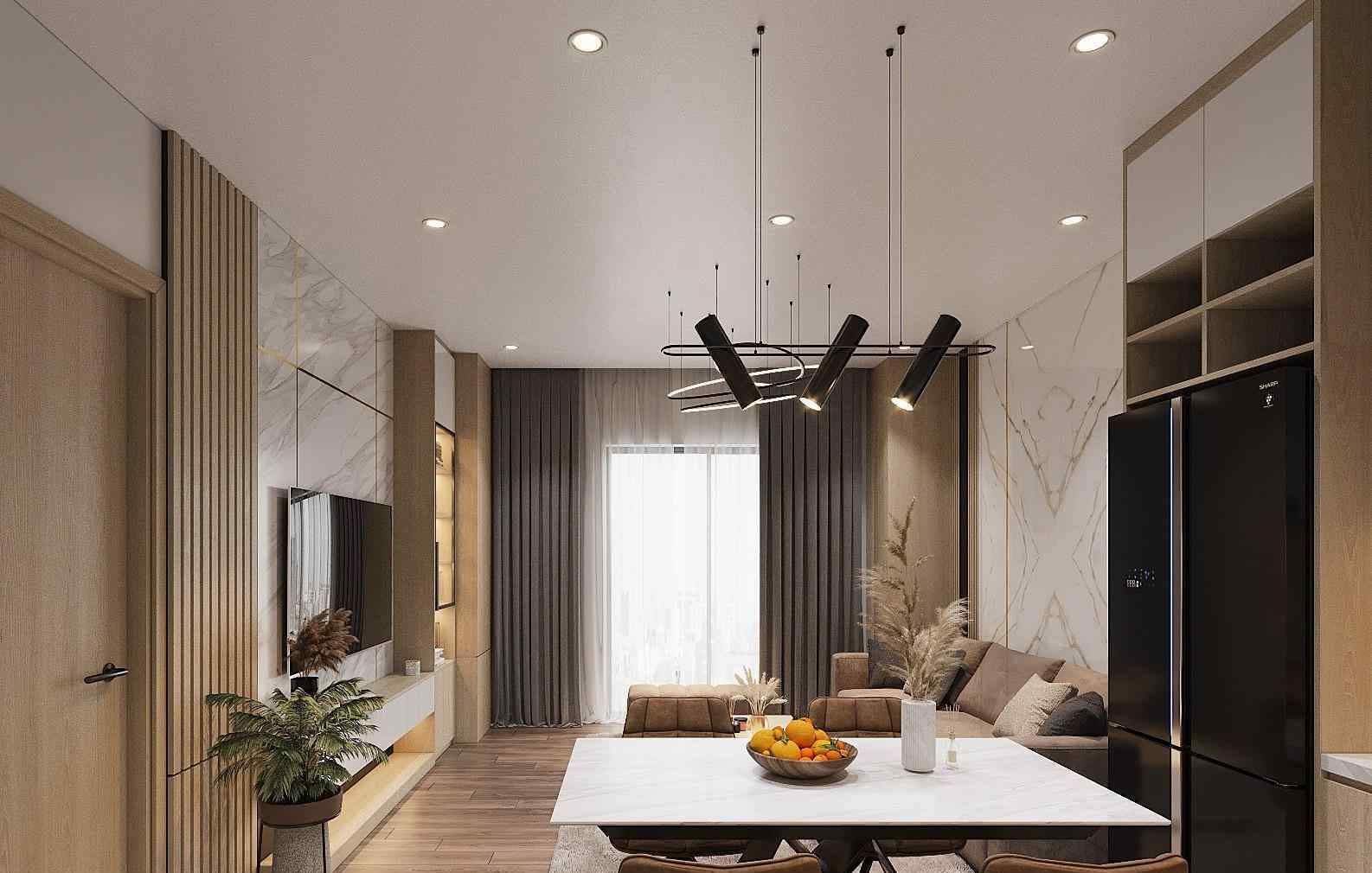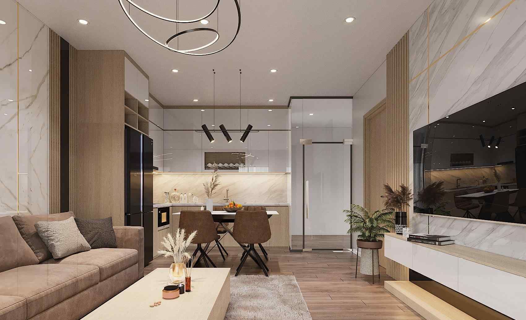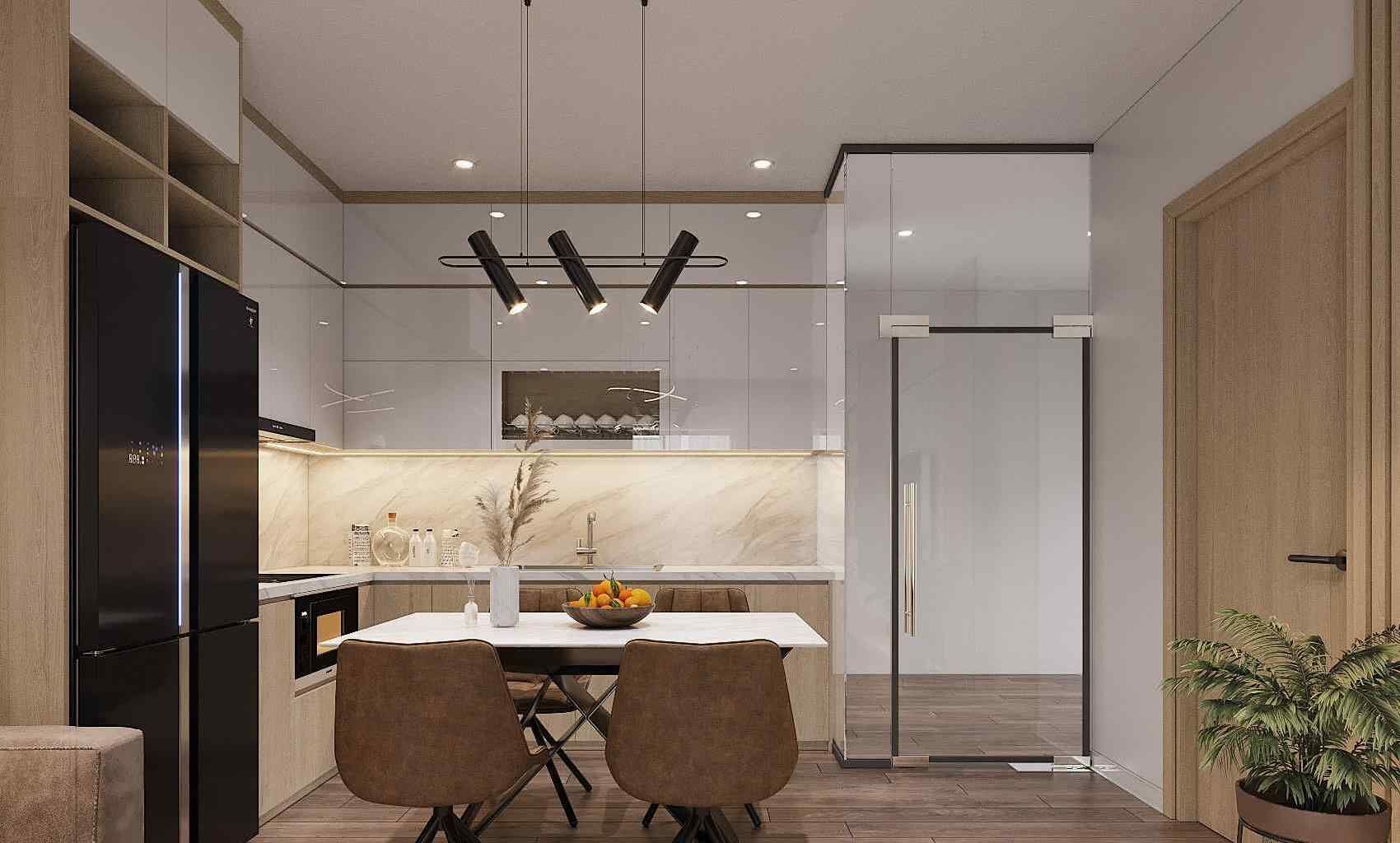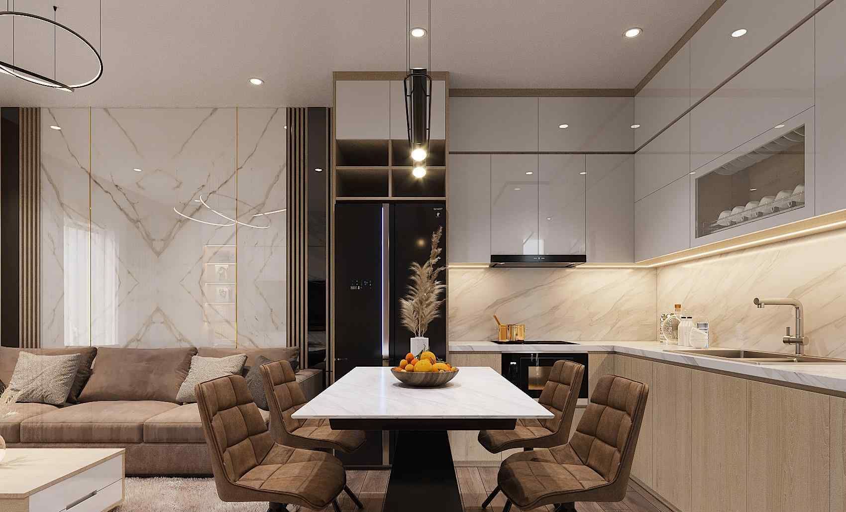 Với diện tích 68m2, việc bố trí phòng bếp liền phòng khách là lựa chọn hợp lý, giúp không gian rộng mở và thuận tiện trong sinh hoạt. Thiết kế bếp chữ L cùng hệ tủ kịch trần giúp tăng tối đa diện tích lưu trữ, giữ cho căn hộ luôn gọn gàng.