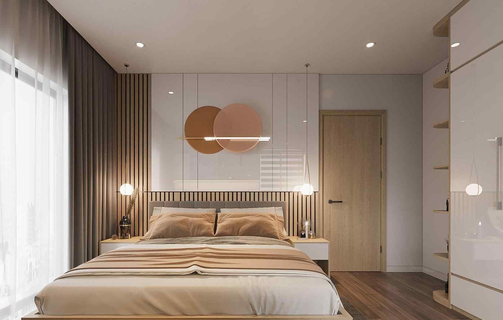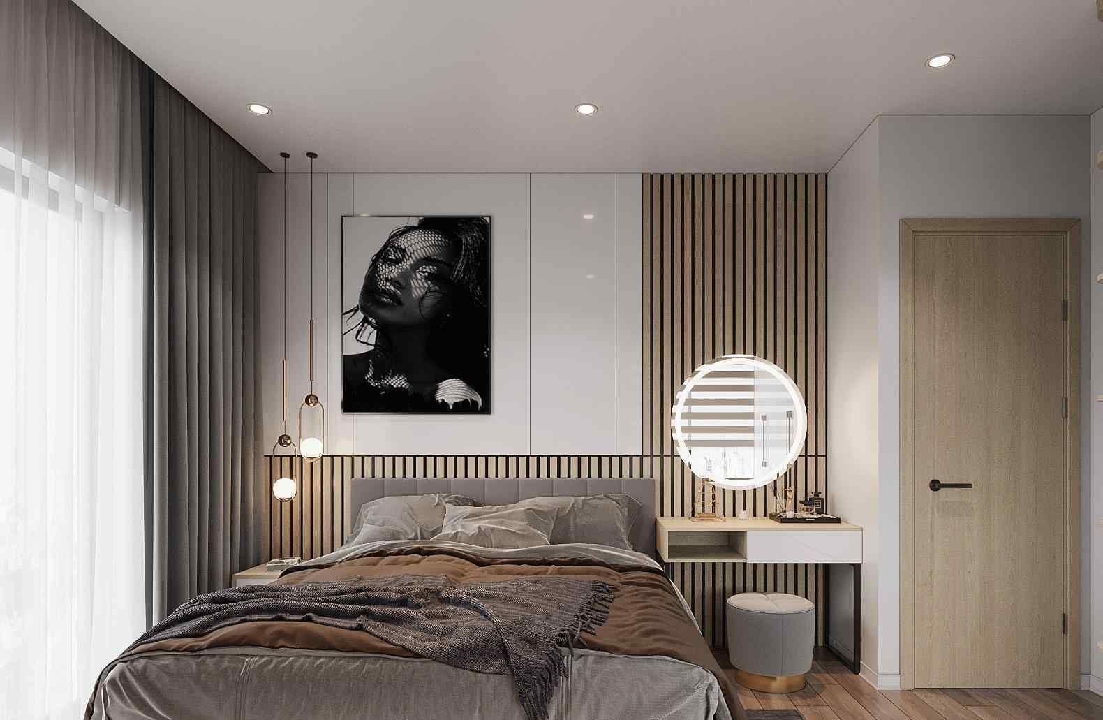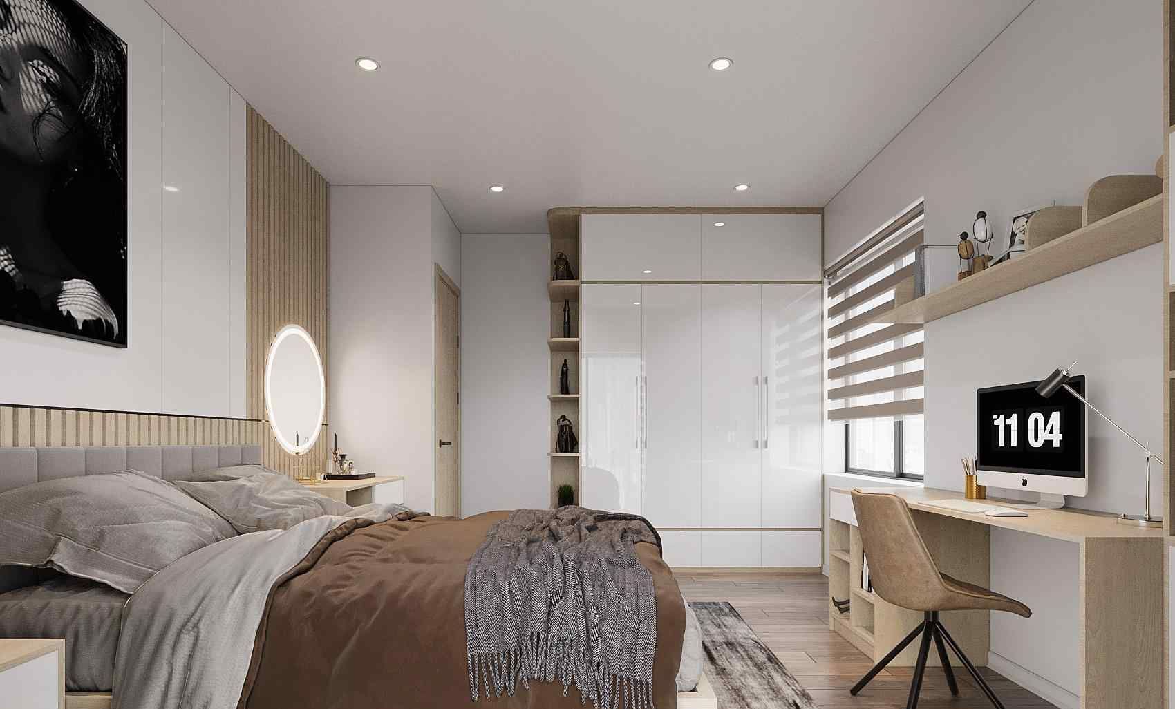 Phòng ngủ master được KTS tại Công ty Nội Thất An Cường Miền Bắc mang phong cách tối giản với điểm nhấn là mảng tường sau giường kết hợp nan gỗ và panel trắng bóng. Chiếc giường lớn được phân chia mảng khối rõ ràng, kết hợp bộ chăn ga màu nâu café tạo không gian nghỉ ngơi ấm áp. Đặc biệt, bàn trang điểm nhỏ gọn đặt cạnh giường, đèn gương LED viền tròn hiện đại, đồng thời hệ tủ quần áo dáng cao, cánh trắng acrylic giúp không gian rộng và sáng. Cách bố trí khoa học này giúp phòng ngủ không chỉ đẹp mà còn có hiệu ứng mở rộng thị giác, phù hợp với diện tích chung cư.