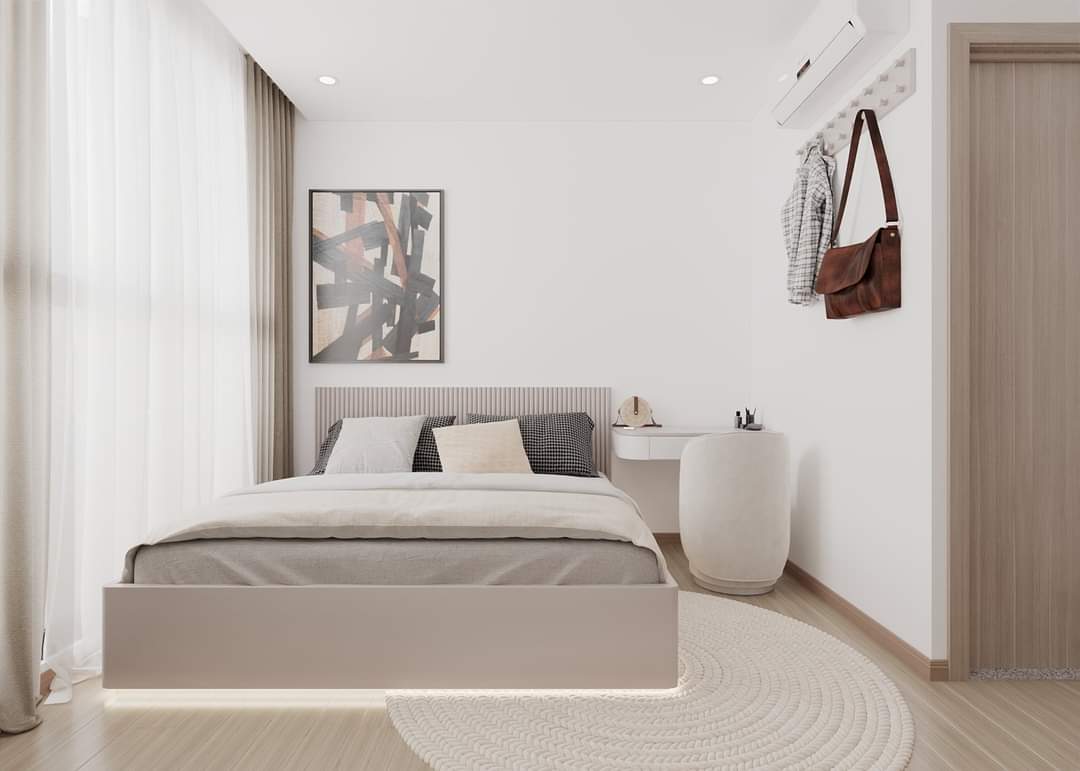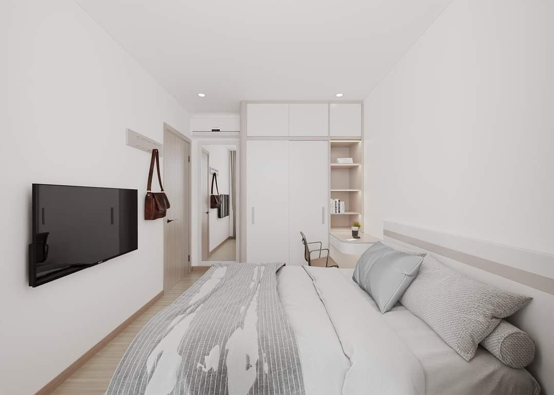 Phòng ngủ, dù có diện tích khá nhỏ, nhưng được thiết kế thông minh để tối ưu hóa không gian sử dụng. Giường ngủ tích hợp ngăn kéo lưu trữ bên dưới giúp giải quyết vấn đề lưu trữ đồ đạc. Tủ quần áo âm tường, bàn làm việc nhỏ gọn và kệ sách được bố trí hợp lý, giúp phòng ngủ trở nên gọn gàng và ngăn nắp. Sự kết hợp giữa tông màu trắng be và các chi tiết nội thất đơn giản tạo nên một không gian nghỉ ngơi thoải mái, thư giãn.