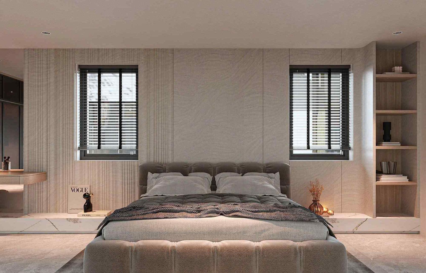 Ánh sáng tự nhiên từ cửa sổ lớn giúp phòng ngủ luôn thông thoáng. Rèm hai lớp được bố trí để điều chỉnh ánh sáng linh hoạt, vừa mang lại riêng tư, vừa đảm bảo thẩm mỹ. Sàn gỗ tạo cảm giác ấm áp, phù hợp với thời tiết và phong cách chung của toàn bộ ngôi nhà. Các mảng tường trang trí được tiết chế, chỉ dùng những chi tiết vừa đủ để tạo điểm nhấn mà không gây rối mắt.