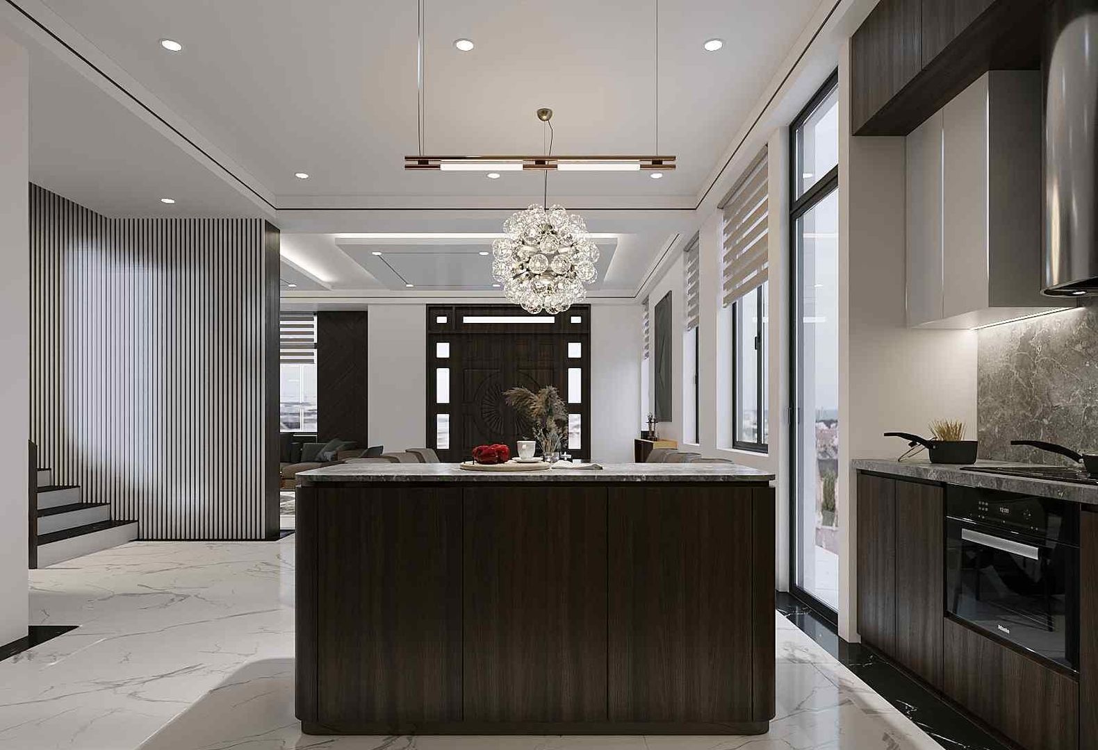 Tủ bếp trên sử dụng acrylic trắng tạo cảm giác rộng rãi, sạch sẽ trong khi hệ tủ dưới bằng gỗ tối màu tạo sự vững chãi và sang trọng. Bề mặt bếp và tường ốp đá tự nhiên mang lại độ bền cao và dễ lau chùi. Đảo bếp thiết kế rộng rãi giúp việc chuẩn bị thức ăn thuận tiện hơn, đồng thời đóng vai trò như một điểm kết nối giữa các thành viên trong gia đình khi nấu nướng.