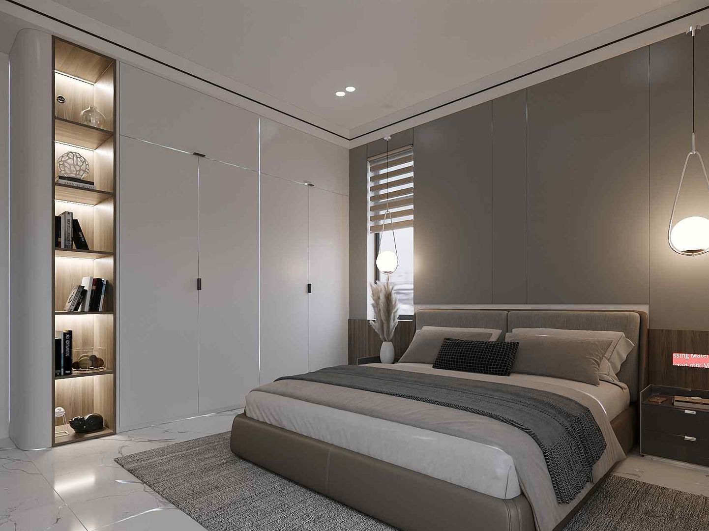 Không gian phòng ngủ trong nhà phố 3 tầng của chú Quân được thiết kế theo tiêu chí thư giãn và tối giản. Màu sắc chủ đạo vẫn là tông trung tính hiện đại, giúp tinh thần dễ dàng thả lỏng sau một ngày dài làm việc. Giường ngủ được bố trí ở vị trí trung tâm căn phòng, kết hợp với tab đầu giường gỗ và hệ đèn ngủ ánh vàng ấm giúp tạo không gian dễ chịu. Tủ quần áo âm tường giúp tiết kiệm diện tích và giữ cho căn phòng luôn gọn gàng.