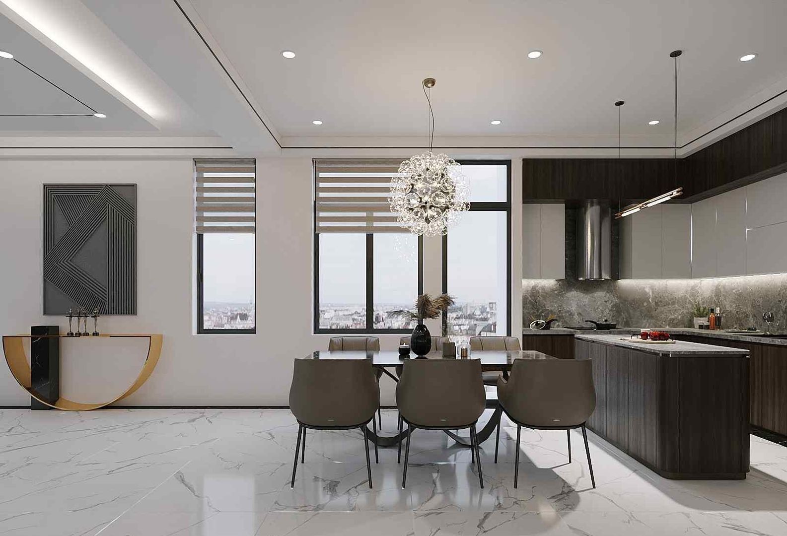 Liền kề với phòng khách là khu vực phòng bếp và bàn ăn được thiết kế theo phong cách mở, tạo sự liên kết mượt mà giữa các khu vực sinh hoạt chung. Sàn nhà lát đá vân mây mở rộng không gian, mang lại vẻ sạch sẽ và tinh tế. Bộ bàn ăn 6 ghế bọc da cao cấp được đặt ở vị trí trung tâm, phía trên là đèn thả pha lê tạo vẻ đẹp lung linh và tăng tính ấm cúng cho không gian quây quần của gia đình.