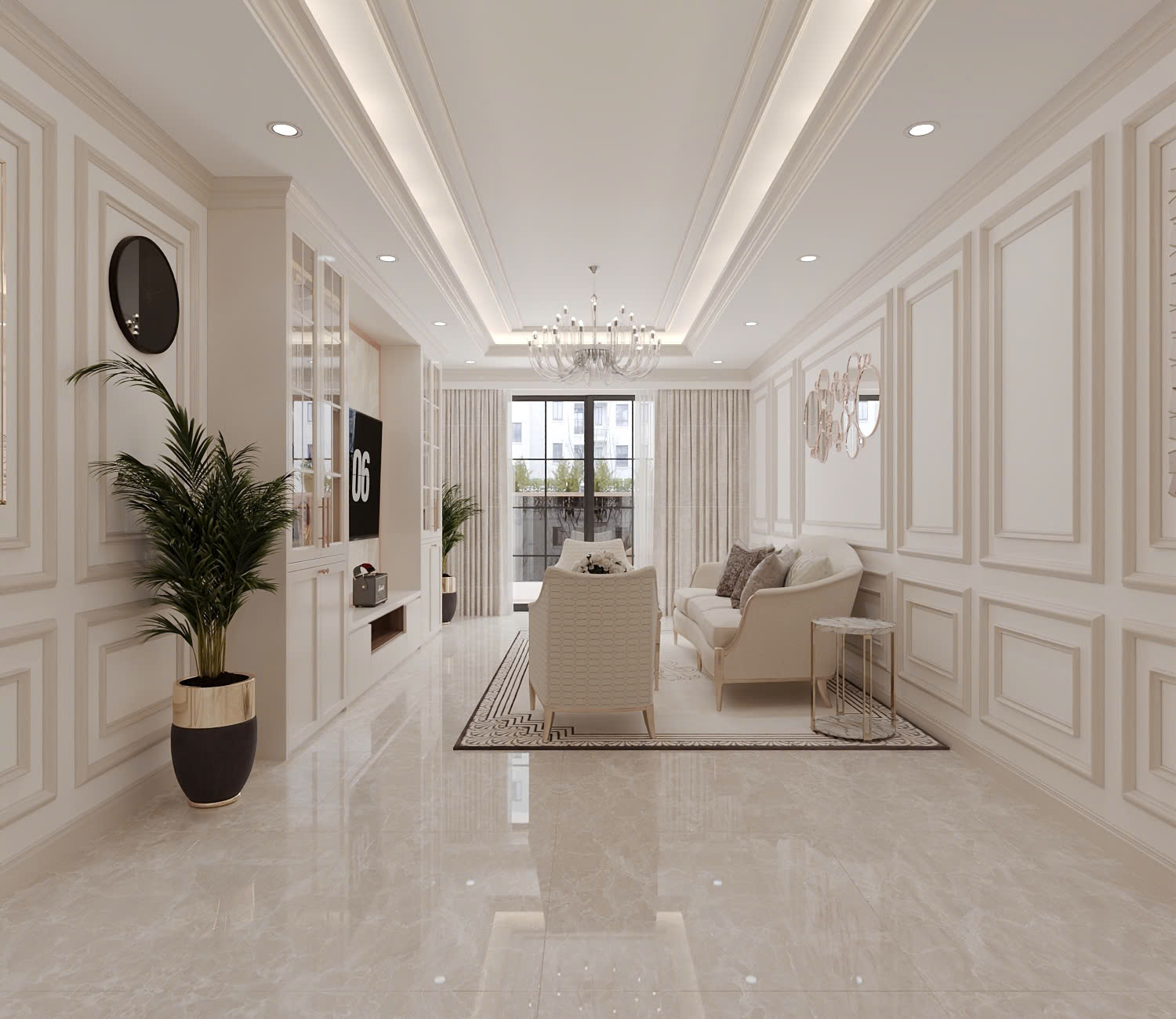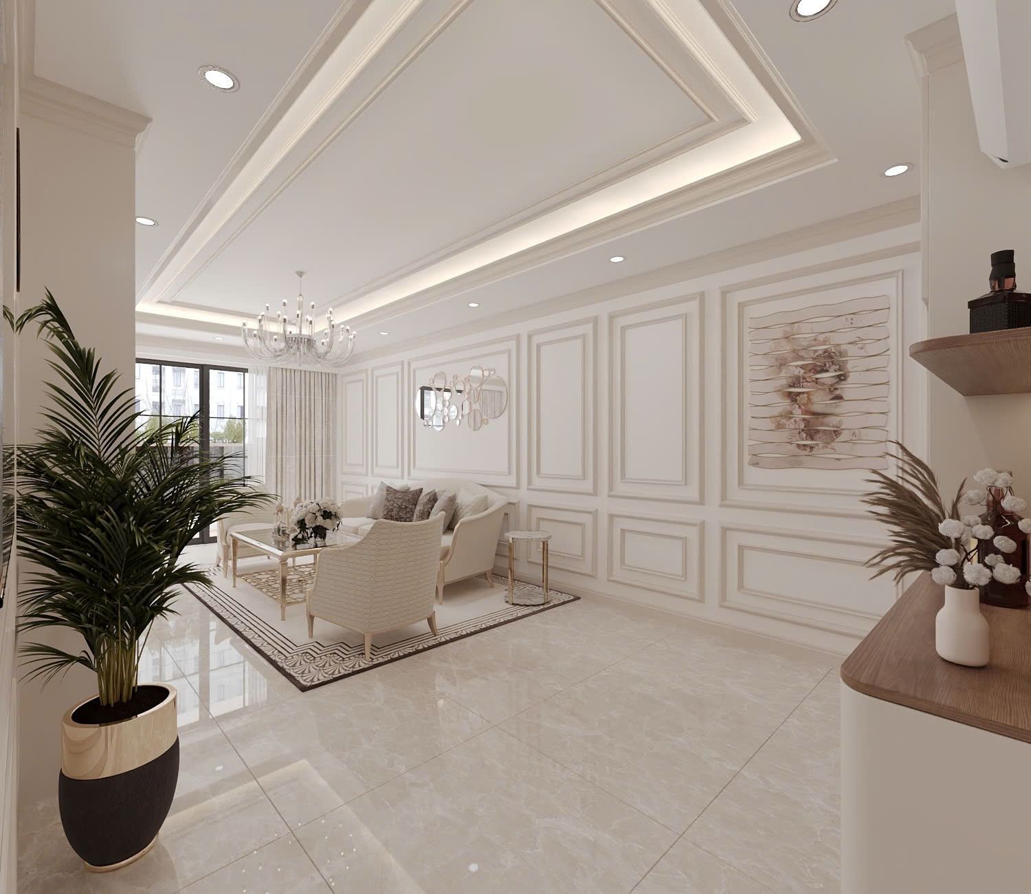 - Phào chỉ tường (Wainscoting): Điểm nhấn đặc trưng nhất là các đường phào chỉ chạy dọc tường và trần nhà với tỷ lệ vàng cân đối. Không quá cầu kỳ như cổ điển truyền thống, phào chỉ tân cổ điển được lược giản, thanh thoát và hiện đại hơn.