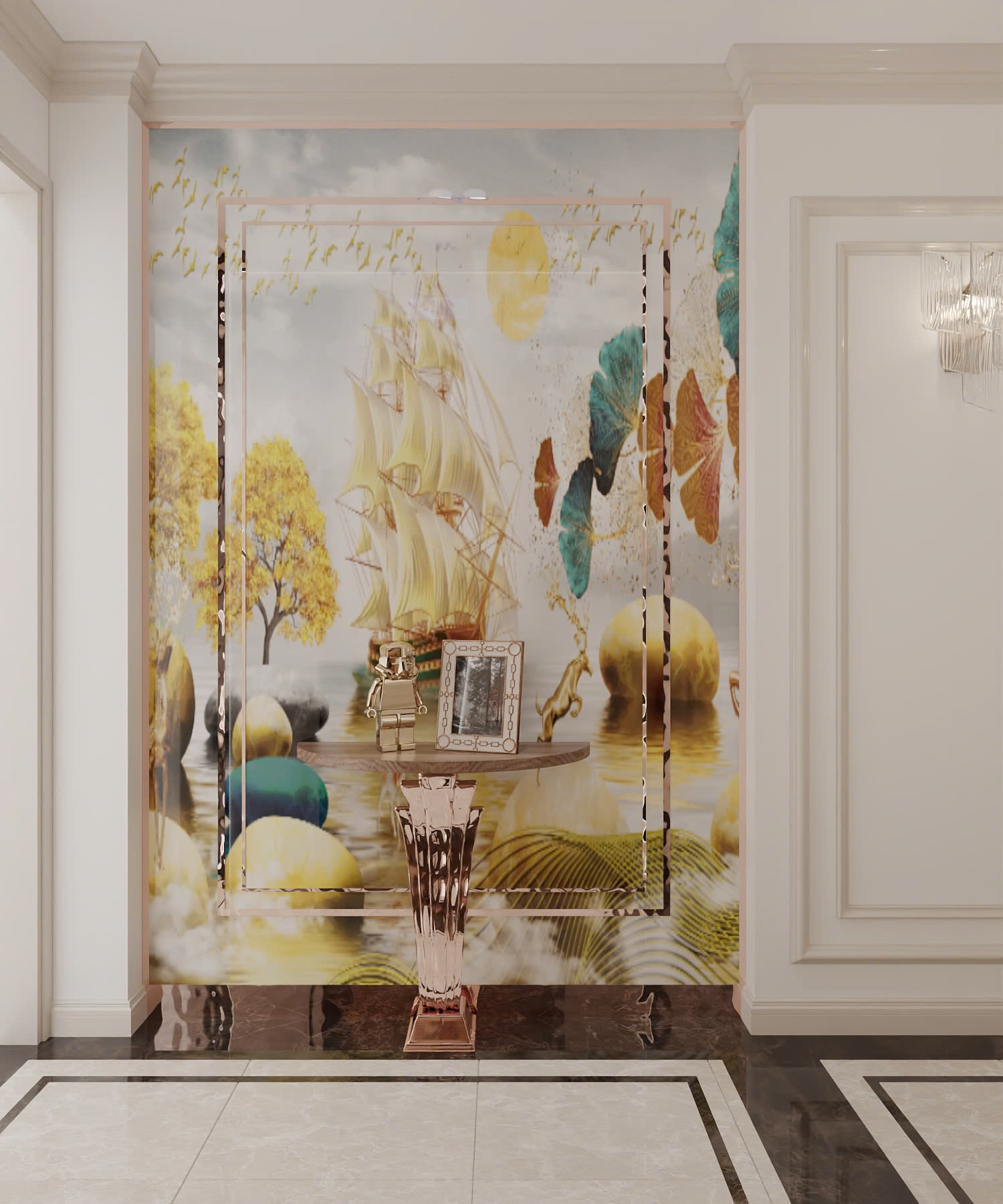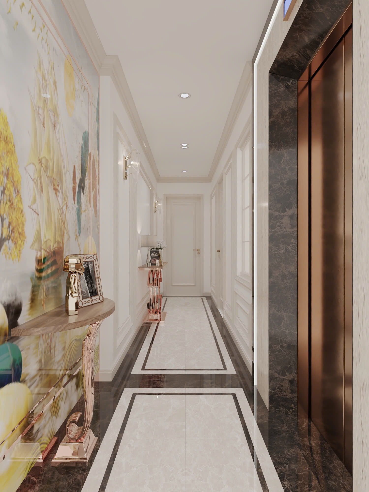 - Tranh nghệ thuật & Decor: Các bức tranh khổ lớn hoặc gương trang trí hình khối lạ mắt được bố trí hài hòa. Đặc biệt, khu vực sảnh đón được trang trí bằng bàn console chân uốn lượn mạ vàng cực kỳ ấn tượng.