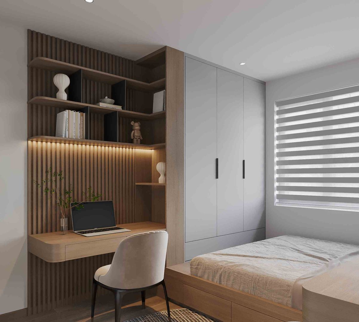 Bàn học liền kệ sách cùng hệ tủ lưu trữ âm tường giúp tối ưu diện tích, đồng thời rèn luyện cho bé thói quen giữ gìn sự ngăn nắp. Góc học tập và giường ngủ được liên kết hài hòa, đảm bảo tính liền mạch trong sinh hoạt hằng ngày.