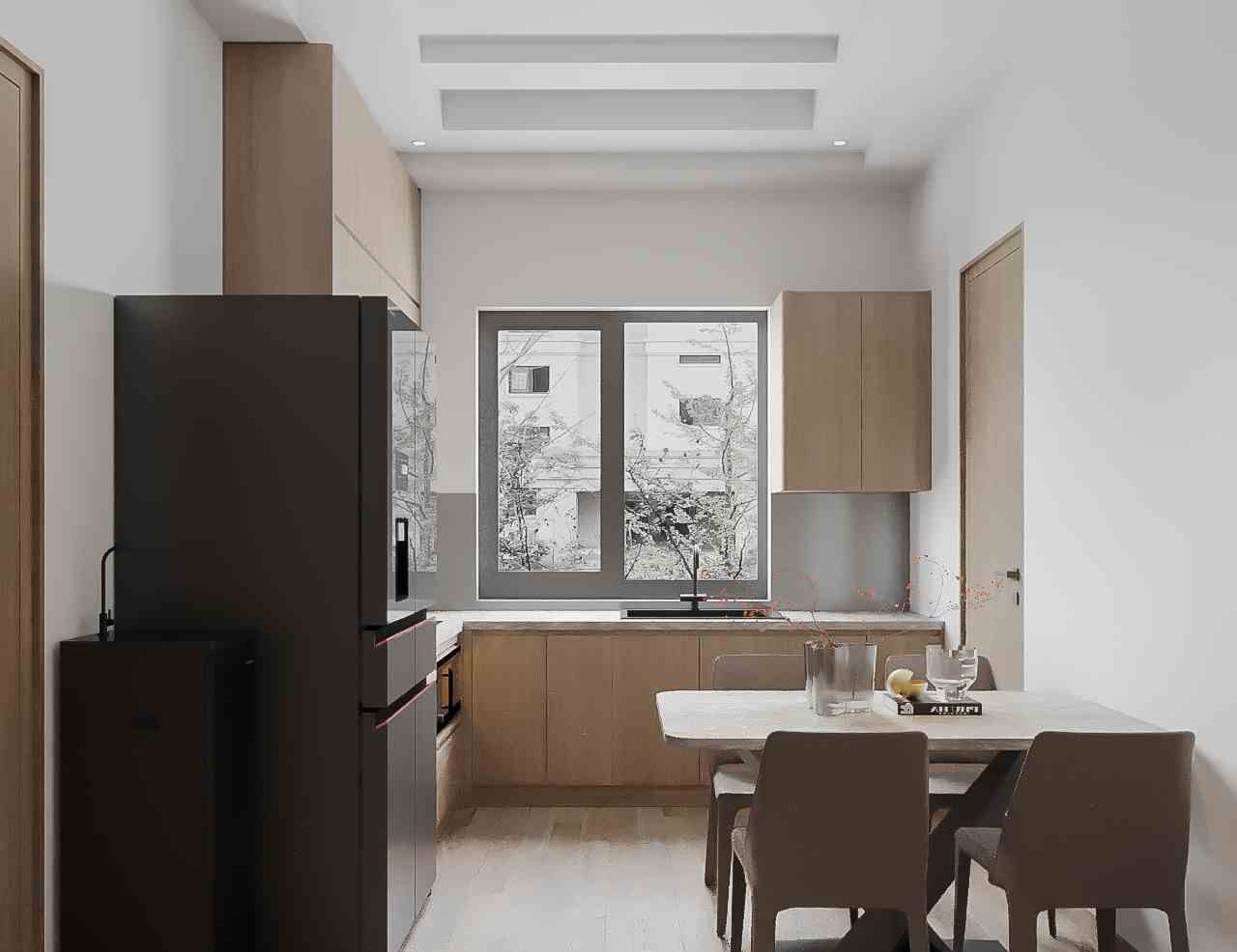 Bàn ăn nhỏ gọn đặt cạnh cửa sổ lớn, vừa đón ánh sáng tự nhiên vừa tạo cảm giác thoáng đãng cho không gian. Chỉ với bộ bàn 4 ghế thanh lịch, khu bếp trở nên ấm cúng, gần gũi nhưng vẫn toát lên nét hiện đại. Đây là nơi không chỉ để nấu nướng mà còn để gia đình sum vầy, gắn kết mỗi ngày.