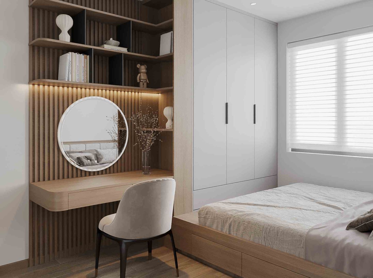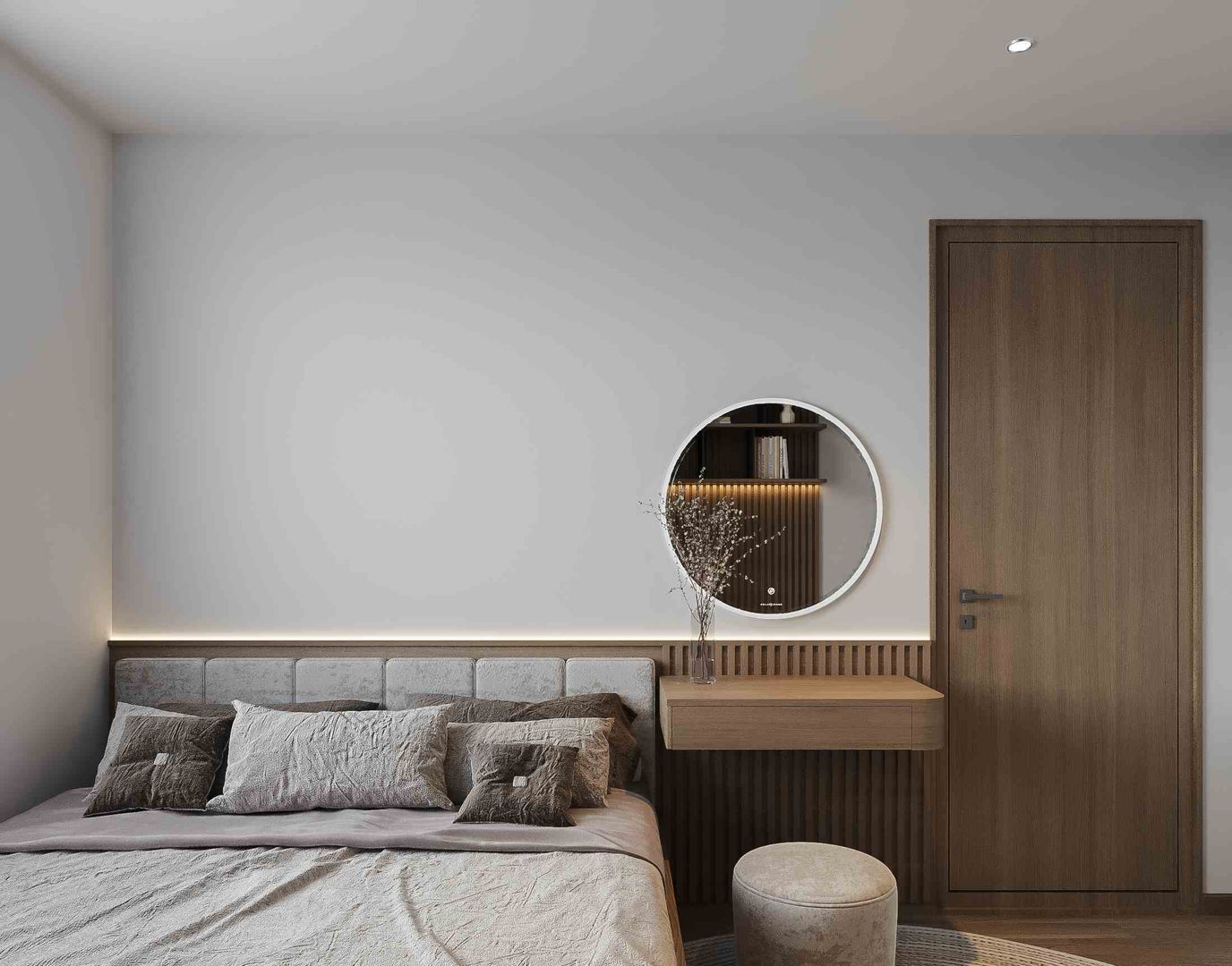 Giường ngủ thiết kế liền mạch, phần đầu giường bọc nỉ tạo cảm giác êm ái, hệ thống đèn hắt âm tường tăng chiều sâu và ánh sáng dịu nhẹ cho căn phòng. Bàn trang điểm tối giản với gương tròn treo tường không chỉ tiện dụng mà còn trở thành điểm nhấn tinh tế, góp phần hoàn thiện sự cân bằng giữa thẩm mỹ và công năng.
