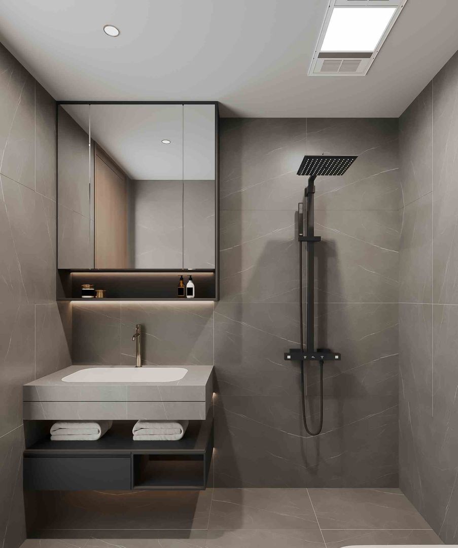 Bố cục được sắp xếp khoa học với bồn rửa mặt tối giản, tủ gương âm tường tiết kiệm diện tích, cùng khu vực tắm đứng trang bị vách kính và vòi sen hiện đại. Điểm nhấn là hệ thống chiếu sáng và kệ lưu trữ thông minh, giúp phòng tắm vừa thoáng đãng vừa tối ưu công năng, đáp ứng nhu cầu sinh hoạt hàng ngày của gia đình.