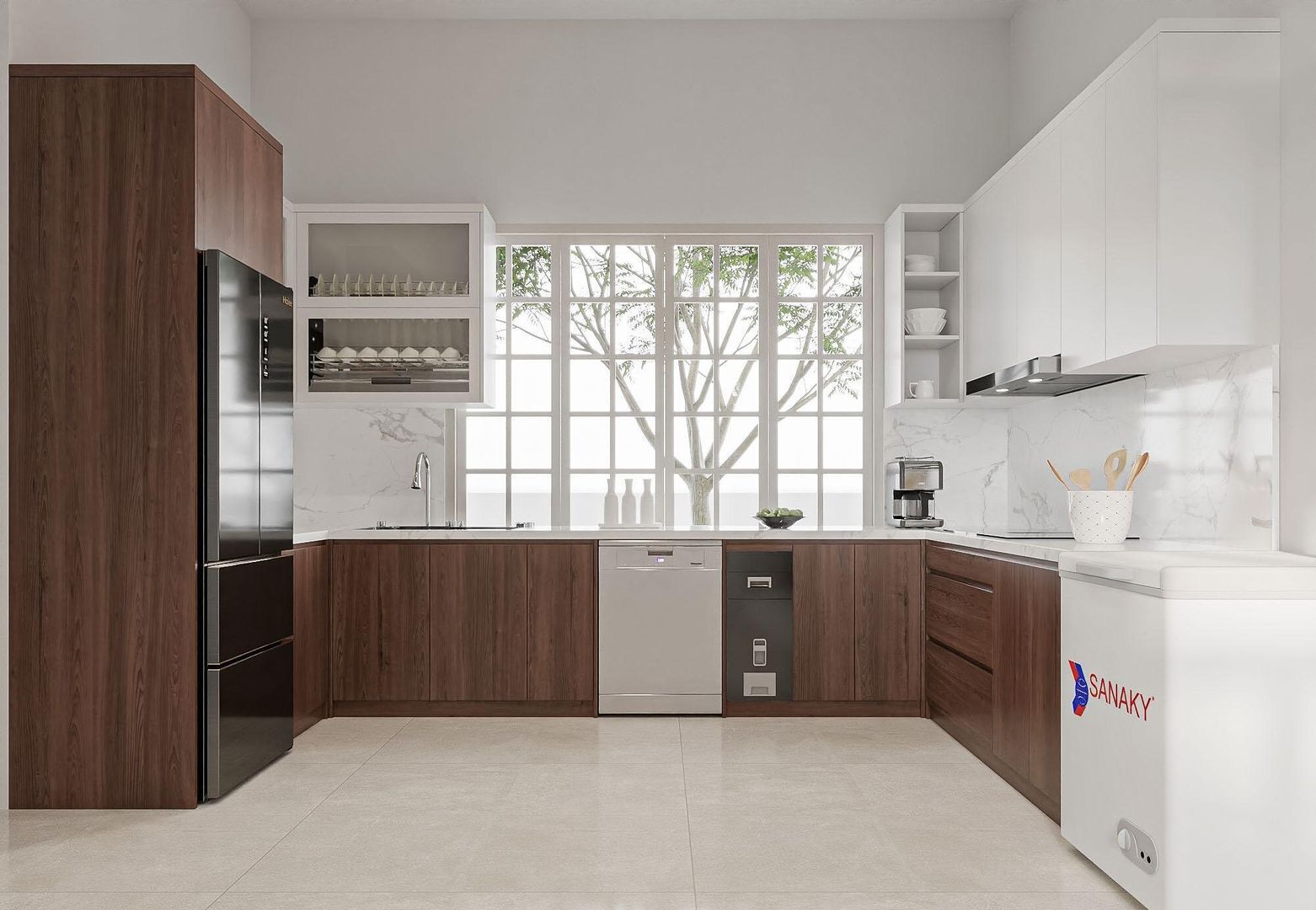 Khi diện tích phòng bếp được phân chia theo mô hình này, người dùng có thể thao tác thuận tiện, không bị cản trở trong quá trình di chuyển, giúp tiết kiệm thời gian và tạo sự thoáng đãng, hiện đại cho không gian bếp.